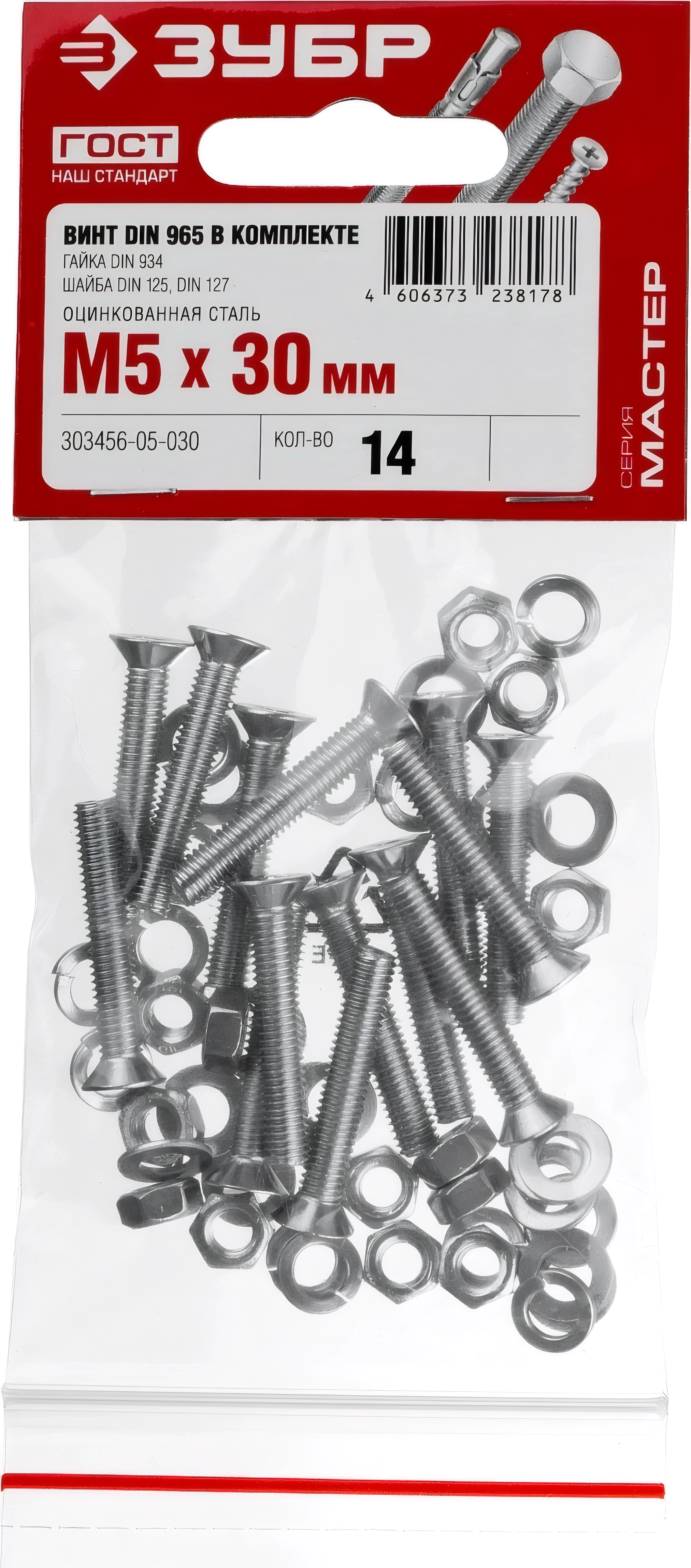 Винт с гайкой и шайбами ЗУБР DIN 965, M5 х 30 мм, цинк, 14 шт