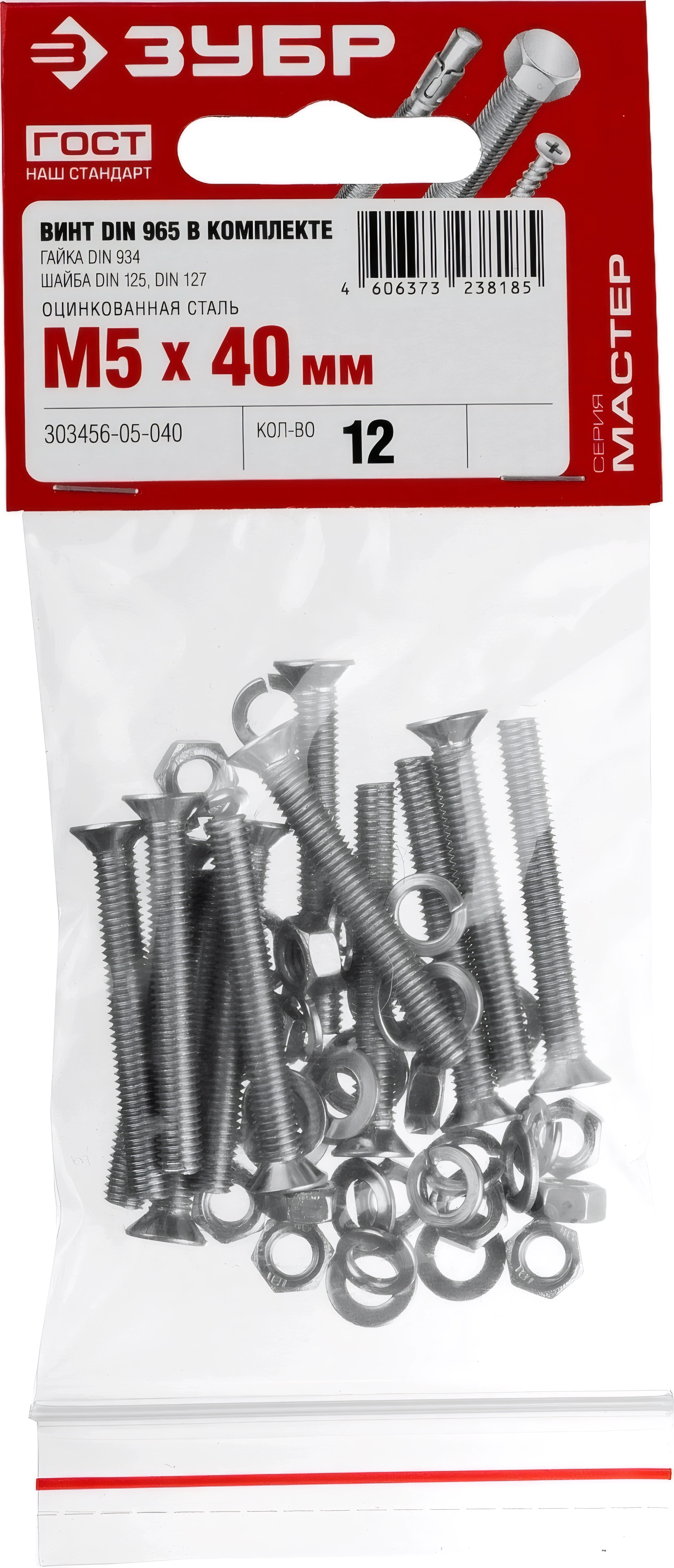 Винт с гайкой и шайбами ЗУБР DIN 965, M5 х 40 мм, цинк, 12 шт
