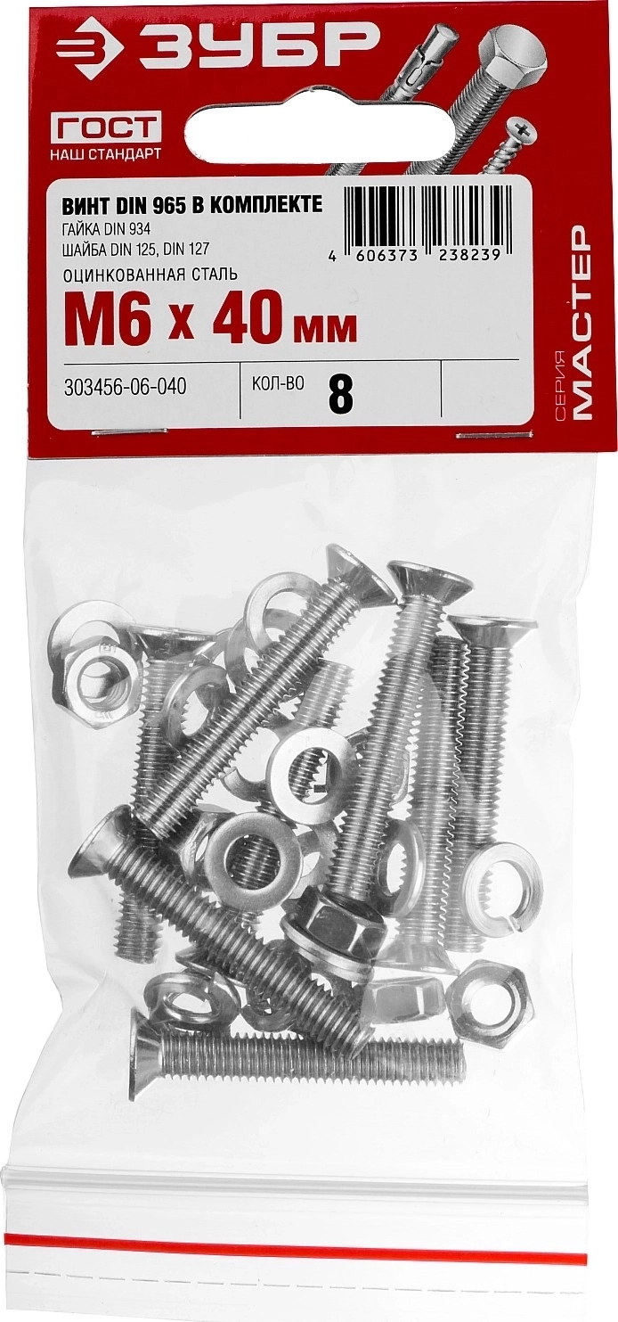 Винт с гайкой и шайбами ЗУБР DIN 965, M6 х 40 мм, цинк, 8 шт