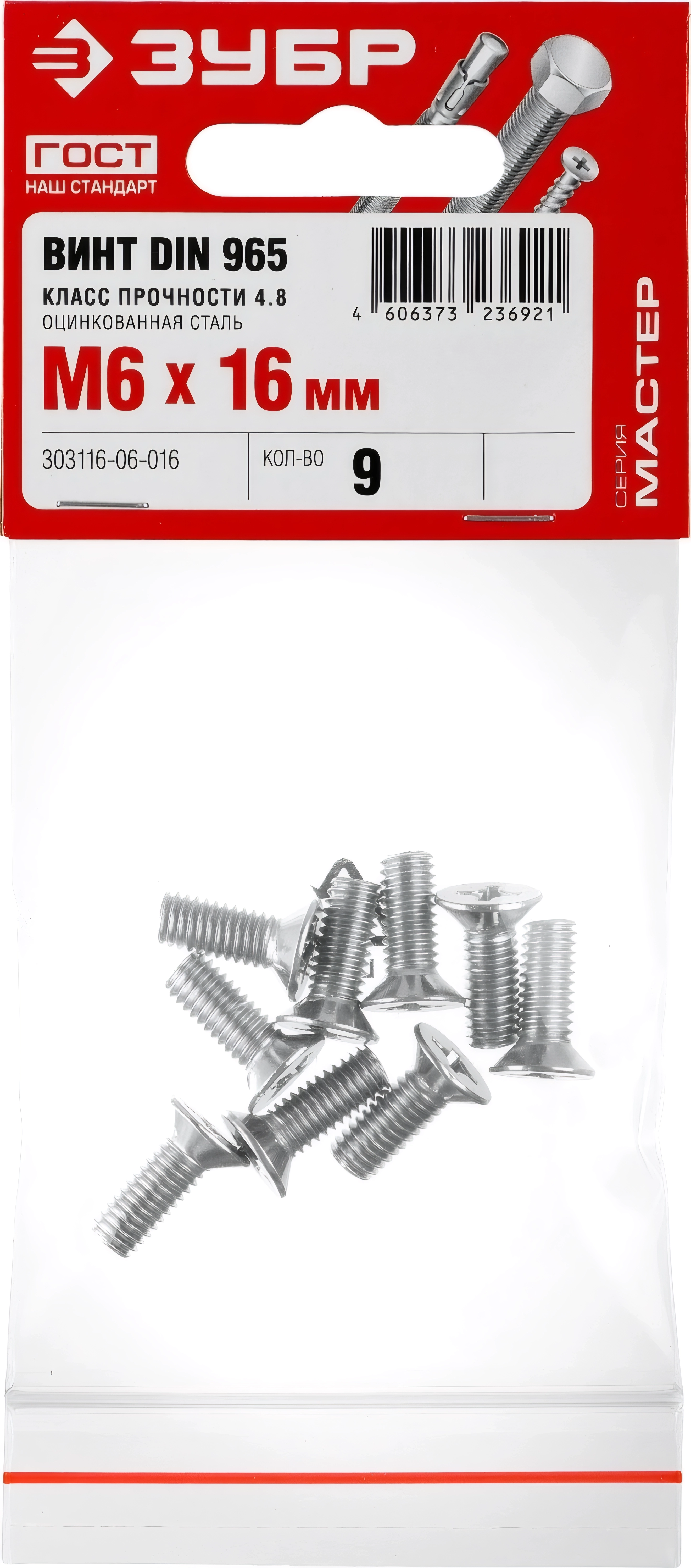 Винт с потайной головкой ЗУБР DIN 965, кл. пр. 4.8, M6 х 16 мм, цинк, 9 шт