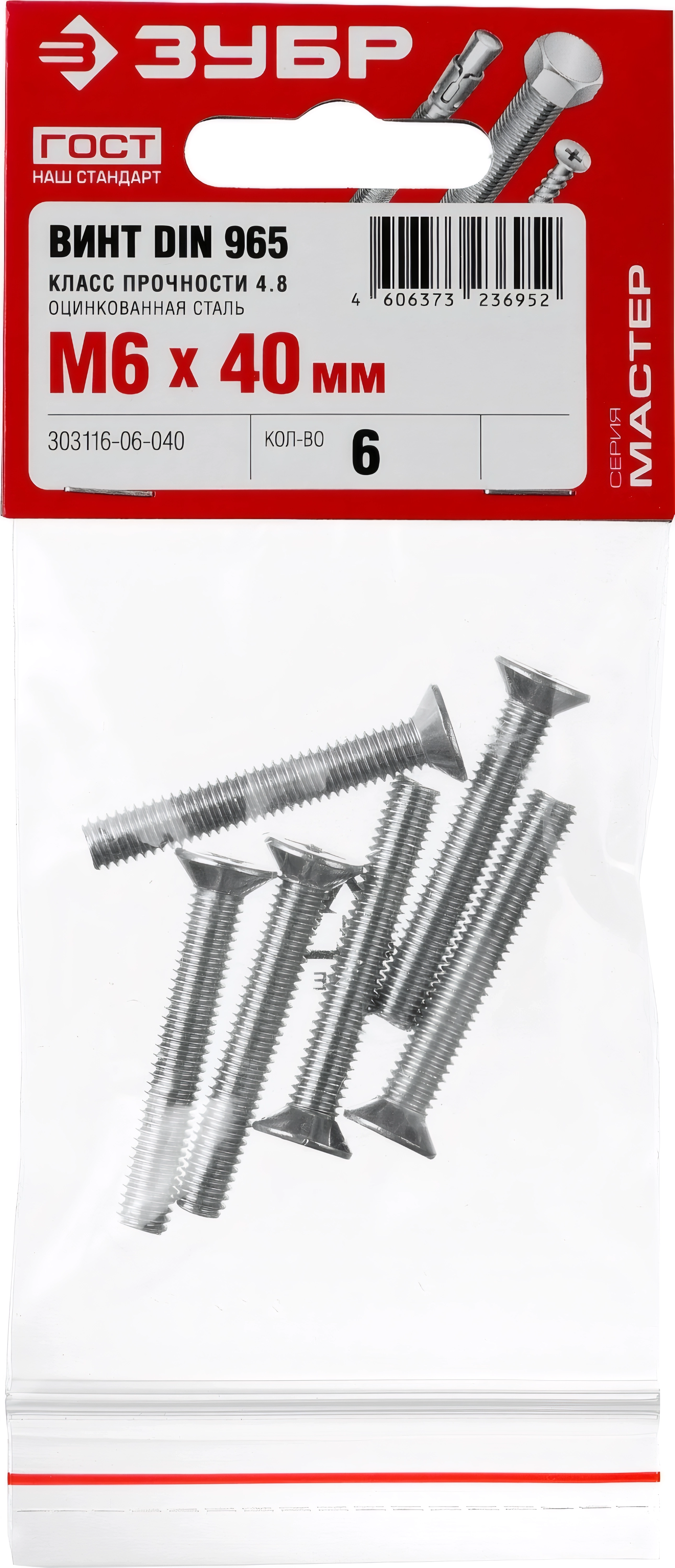 Винт с потайной головкой ЗУБР DIN 965, кл. пр. 4.8, M6 х 40 мм, цинк, 6 шт