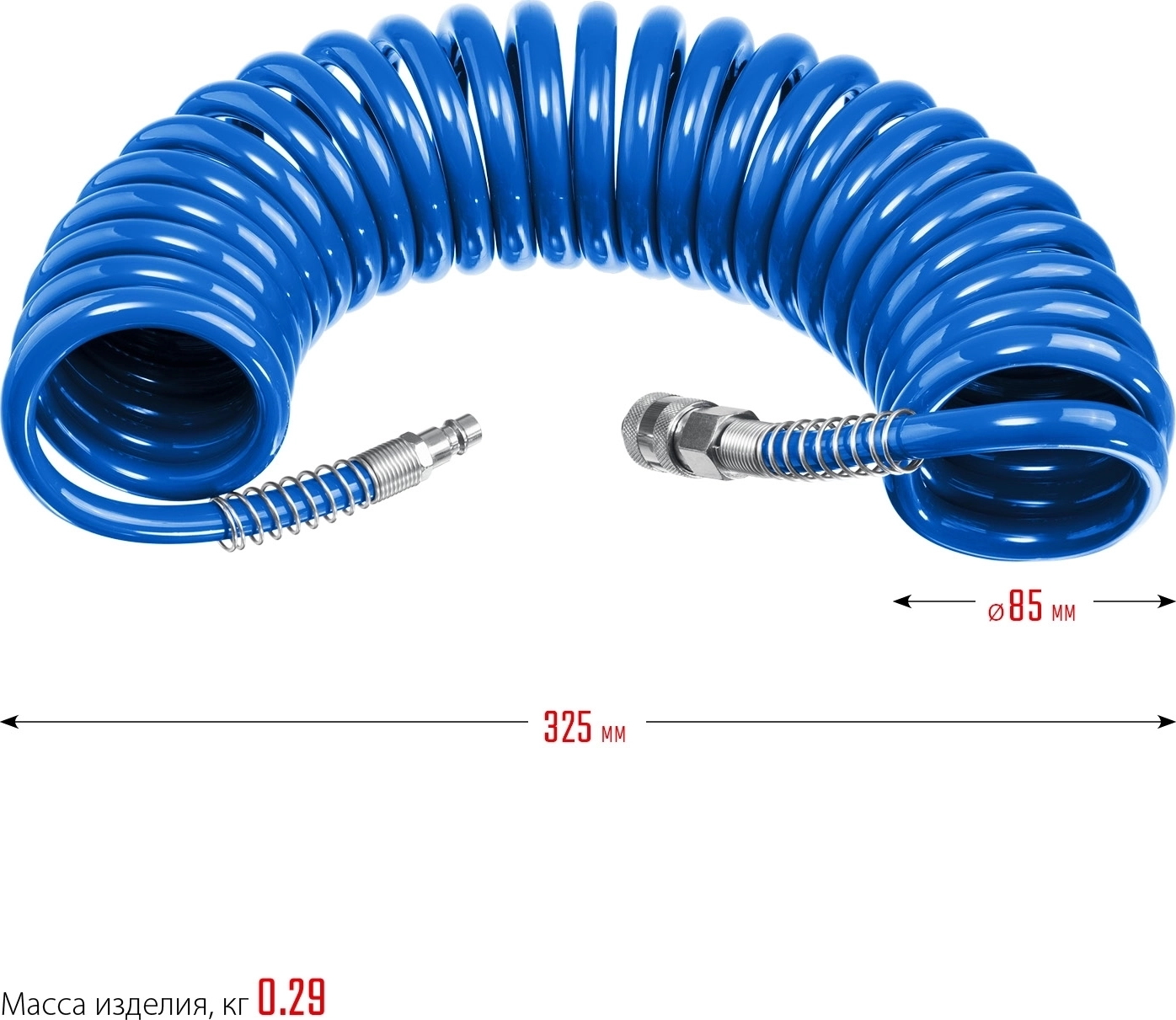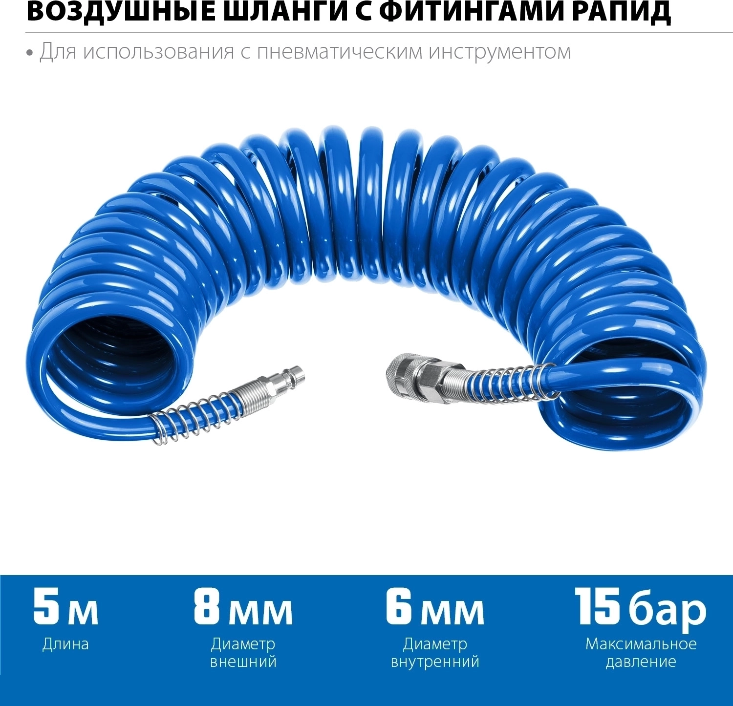 Воздушный спиральный шланг с фитингами рапид ЗУБР 5 м 6 х 8 мм 15 бар