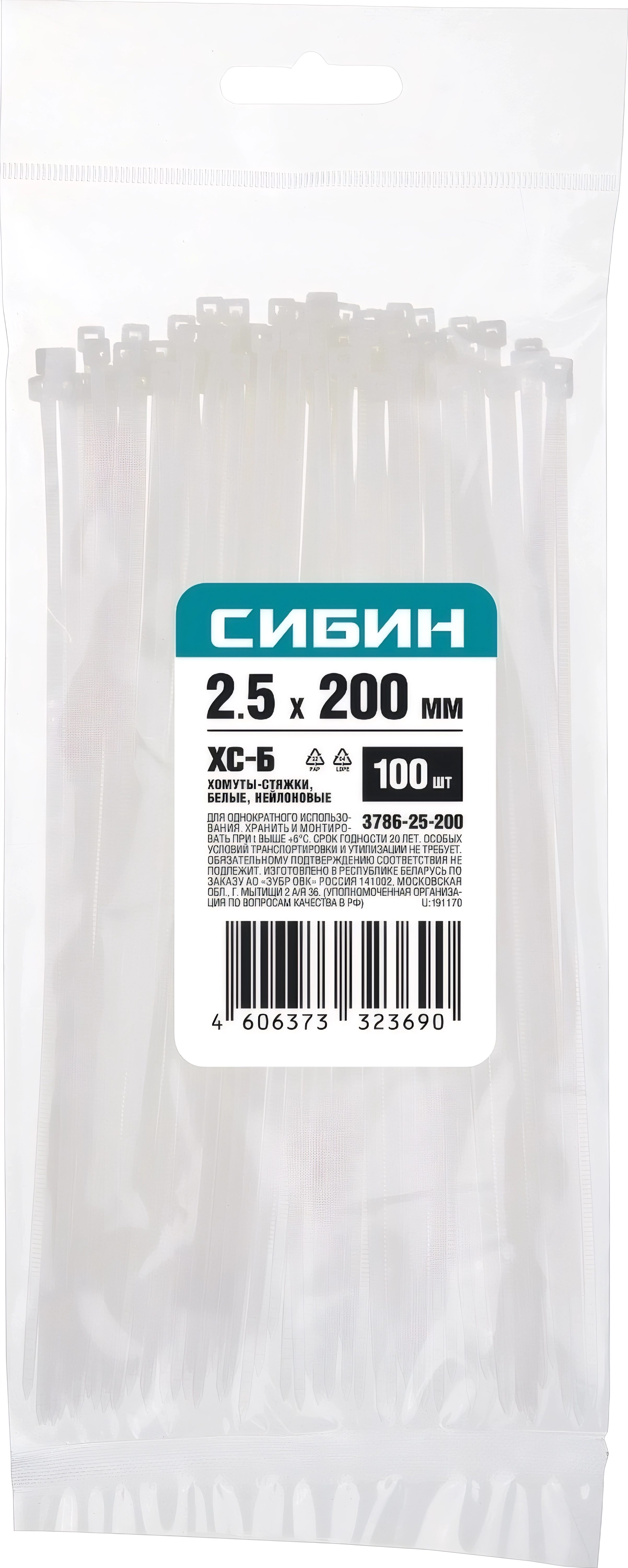 Хомуты-стяжки СИБИН ХС-Б, 2.5 x 200 мм, нейлон РА66, 100 шт, белые