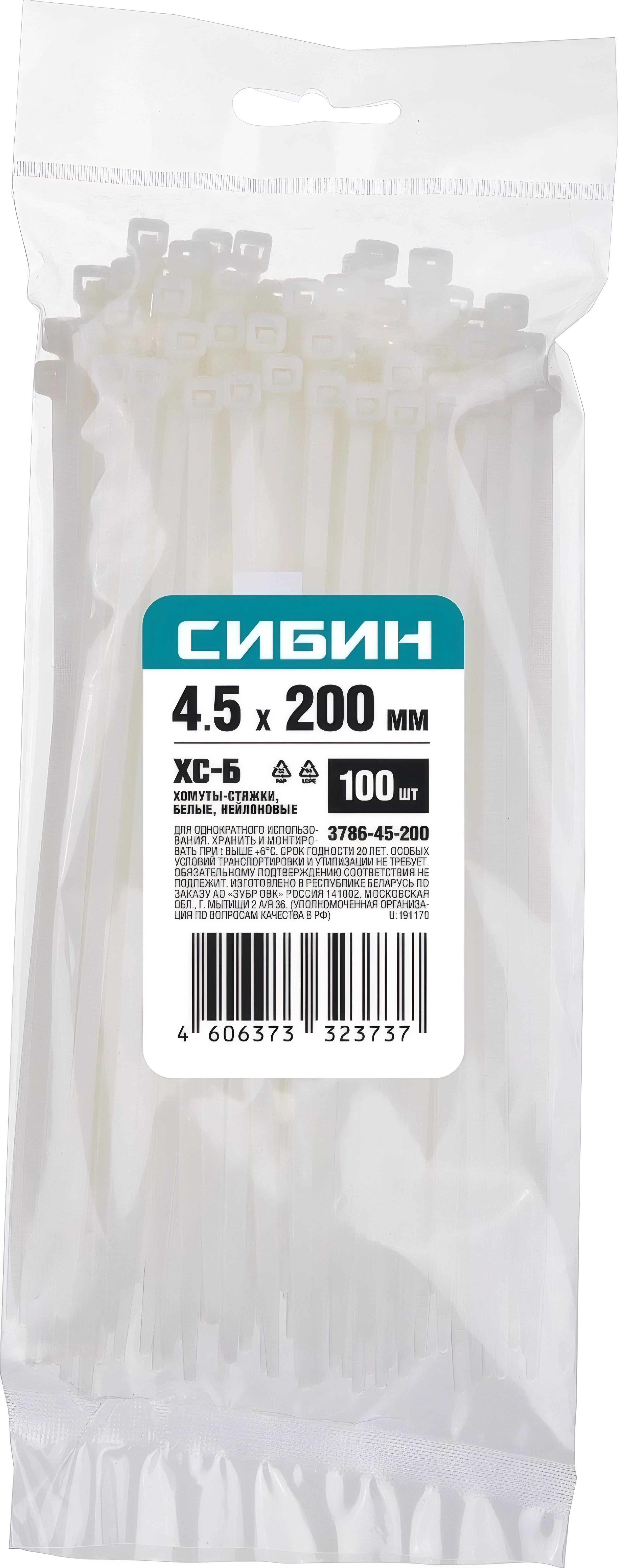 Хомуты-стяжки СИБИН ХС-Б, 4.5 x 200 мм, нейлон РА66, 100 шт, белые
