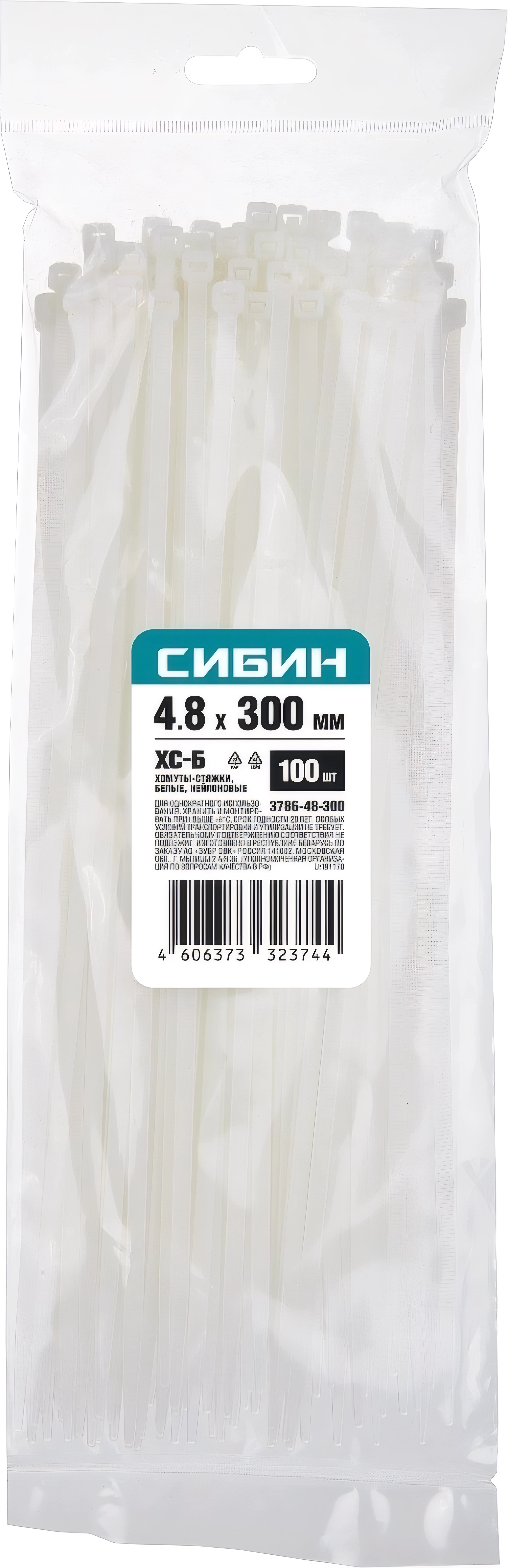 Хомуты-стяжки СИБИН ХС-Б, 4.8 x 300 мм, нейлон РА66, 100 шт, белые