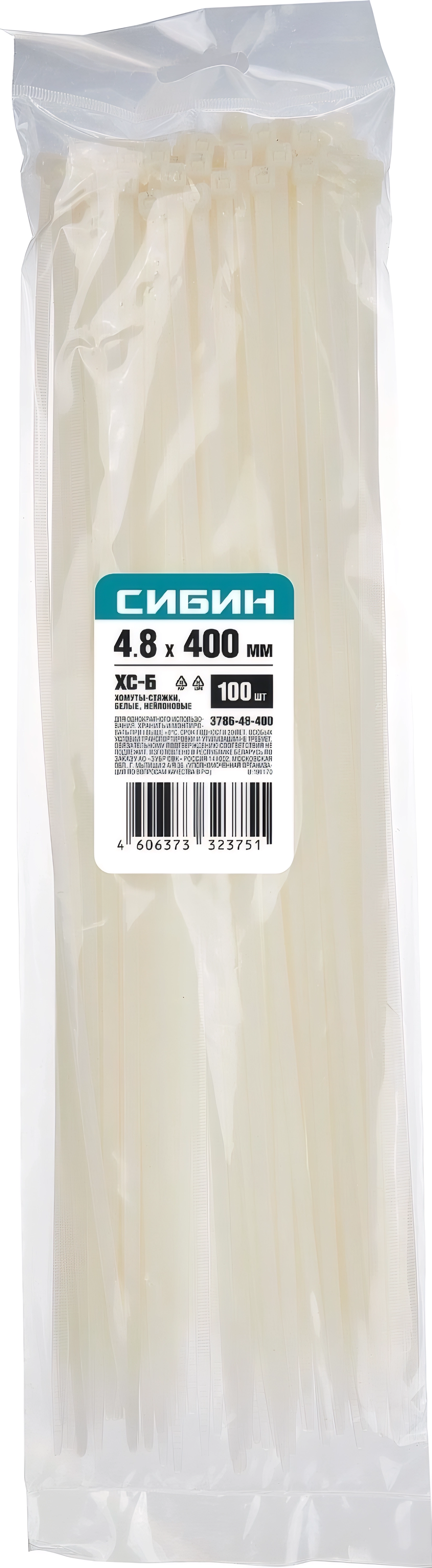 Хомуты-стяжки СИБИН ХС-Б, 4.8 x 400 мм, нейлон РА66, 100 шт, белые