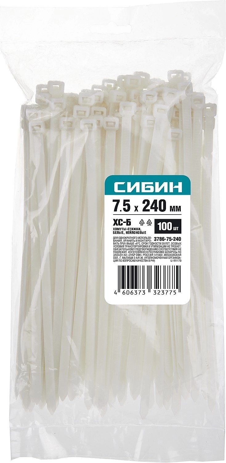 Хомуты-стяжки СИБИН ХС-Б, 7.5 x 240 мм, нейлон РА66, 100 шт, белые