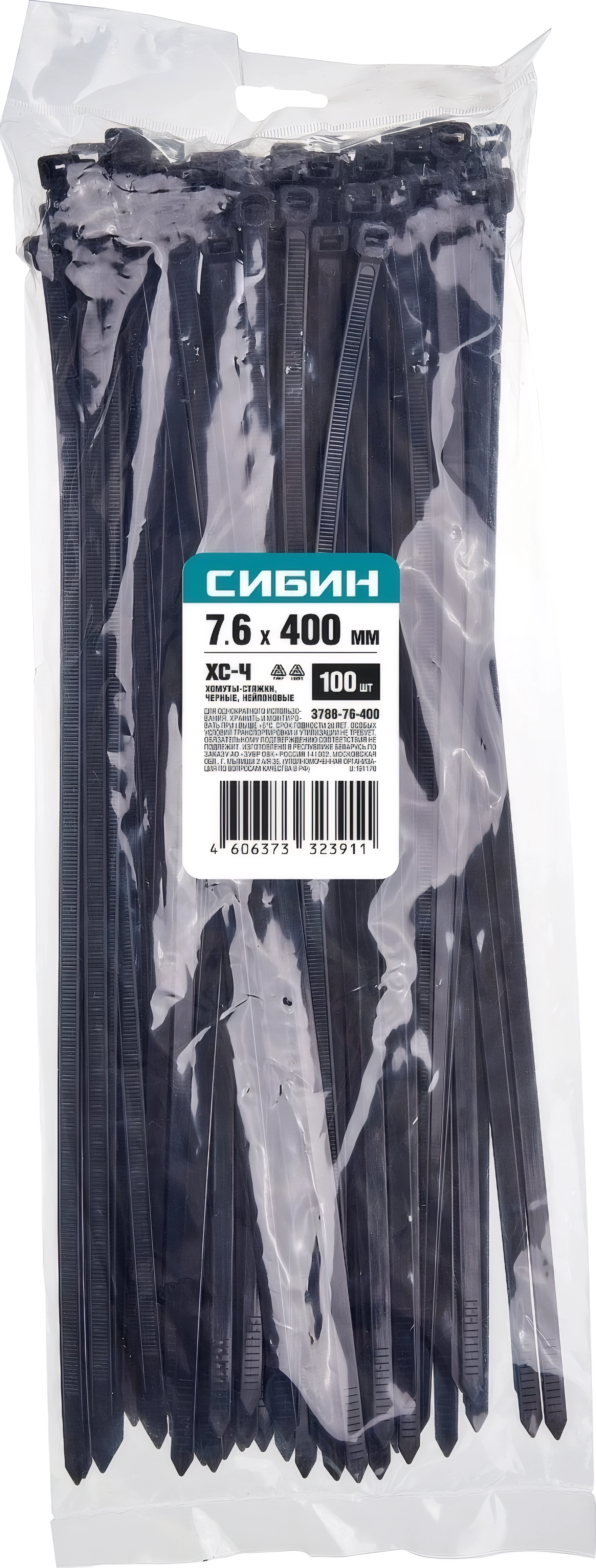 Хомуты-стяжки СИБИН ХС-Ч, 7.6 x 400 мм, нейлон РА66, 100 шт, черные