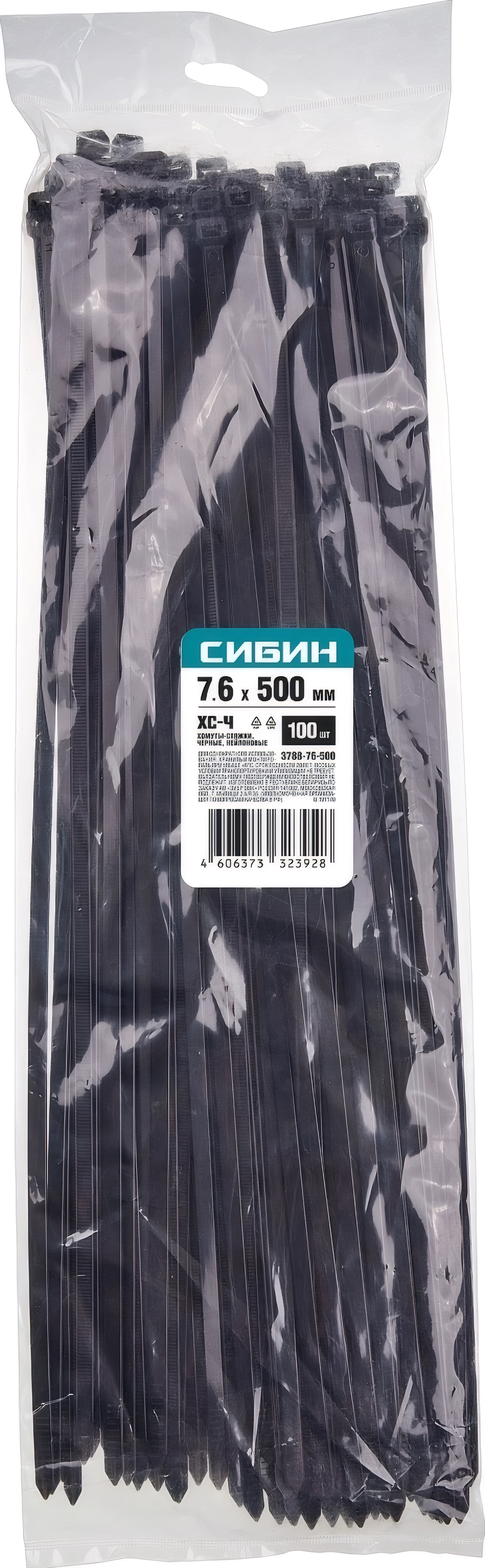 Хомуты-стяжки СИБИН ХС-Ч, 7.6 x 500 мм, нейлон РА66, 100 шт, черные