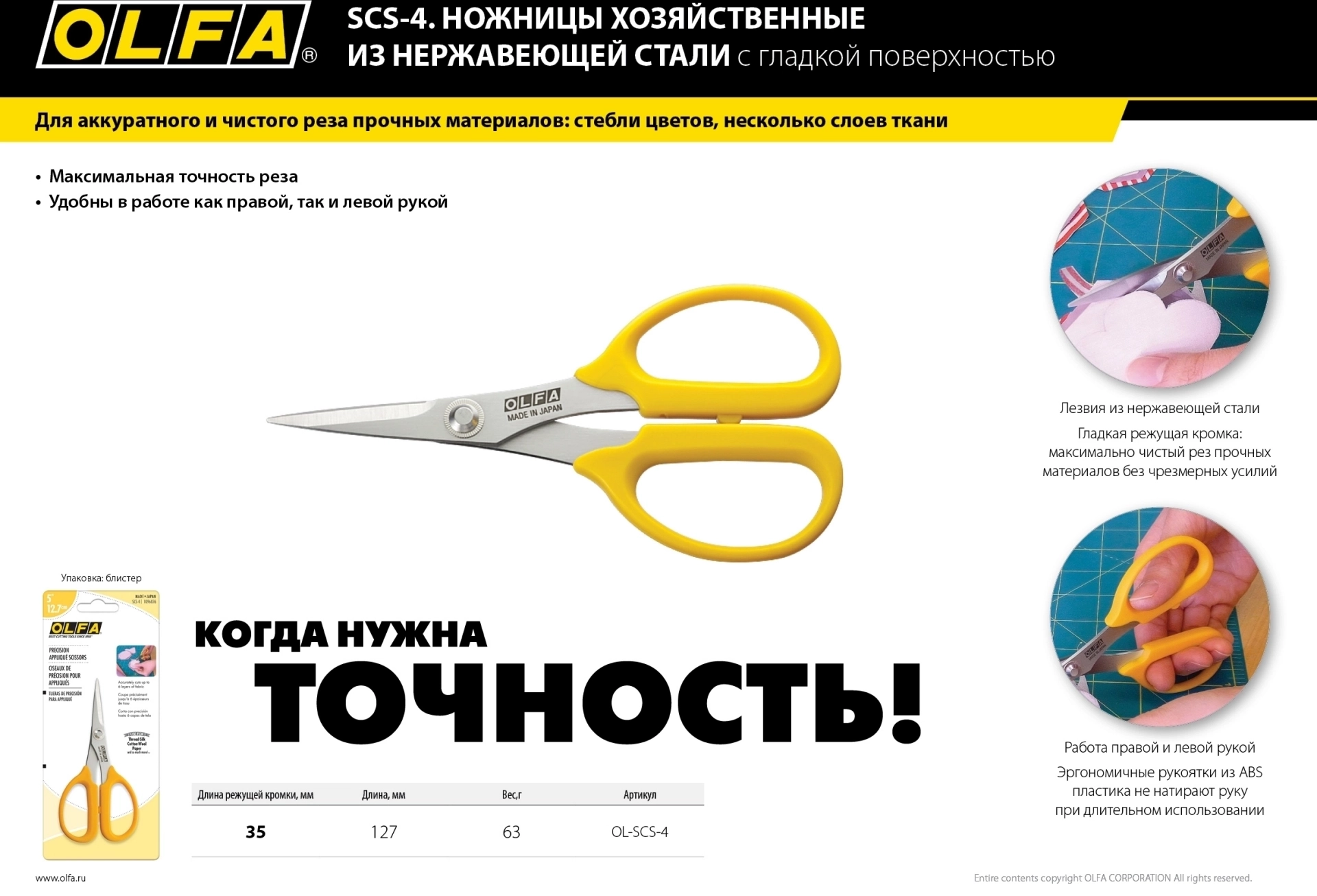 Выбирайте ножницы OLFA SCS-4 для задач, требующих максимальной точности реза. Изготовлены из высококачественной нержавеющей стали и имеют непревзойденную остроту от основания до кончика лезвий, обеспечивающую высокую эффективность в любом проекте.