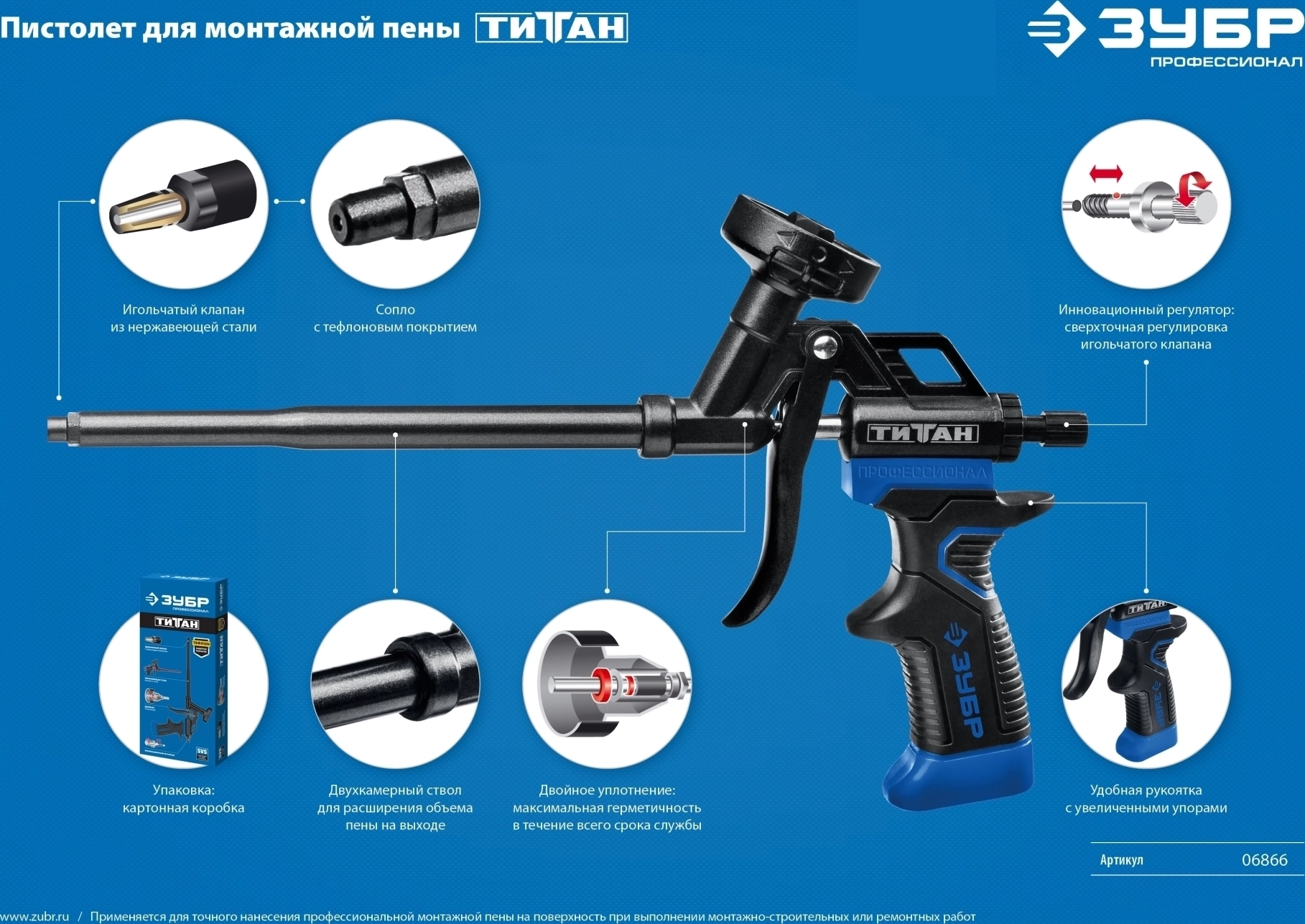 Пистолет для монтажной пены ТИТАН это инновационный инструмент, предназначенный для профессионального применения, отличающийся непревзойдённой герметичностью, высокой надёжностью и удобством в работе. Инструмент имеет полное тефлоновое покрытие, что обеспечивает быструю и простую очистку.