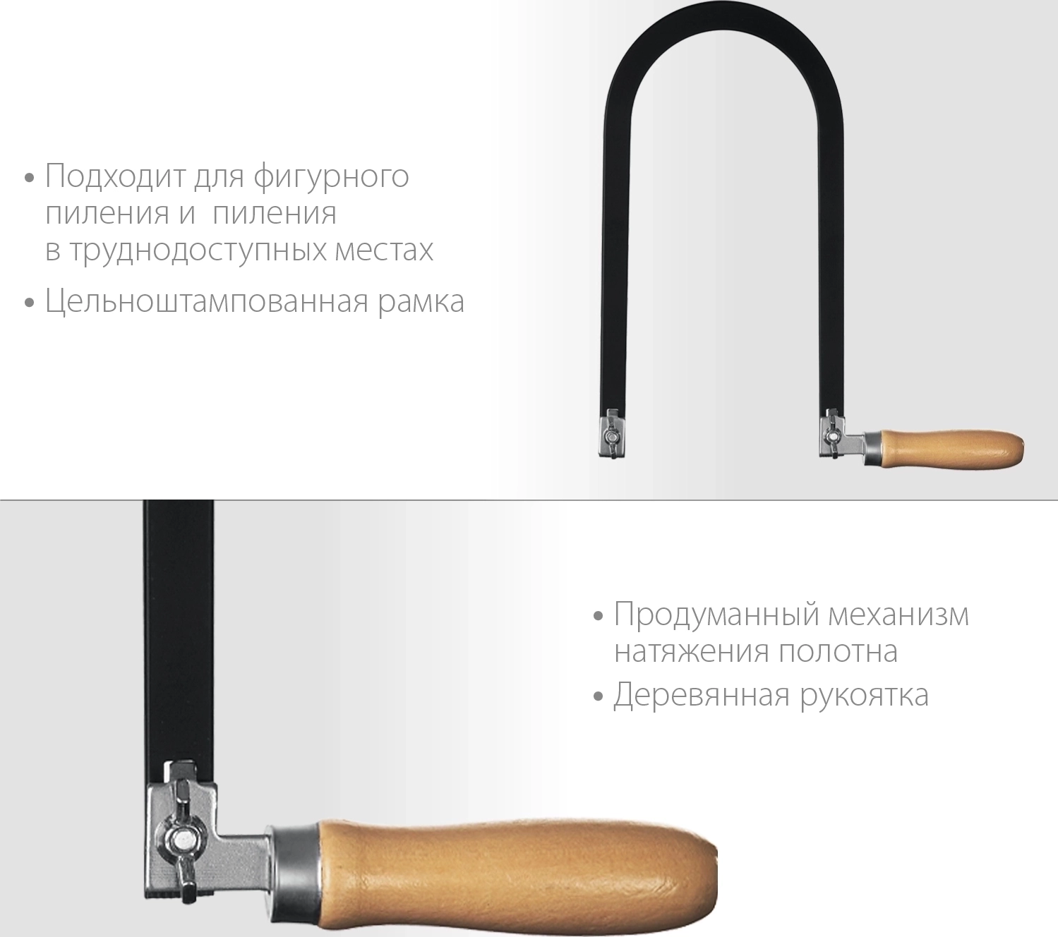 - Механизм натяжения полотна обеспечивает быструю смену и надежное крепление в рамке лобзика,