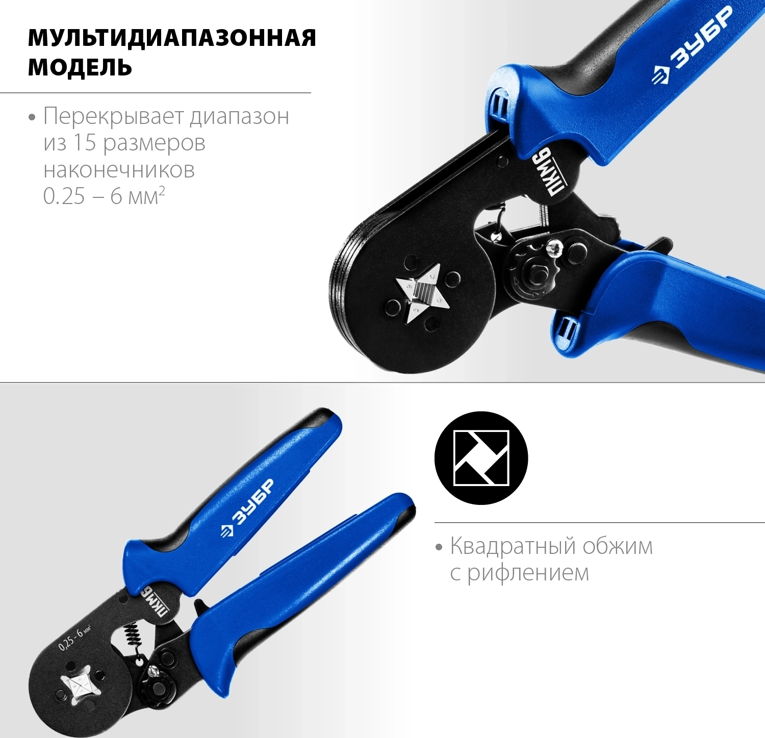- Обжим изолированных и неизолированных втулочных наконечников 0.25-6 мм2.