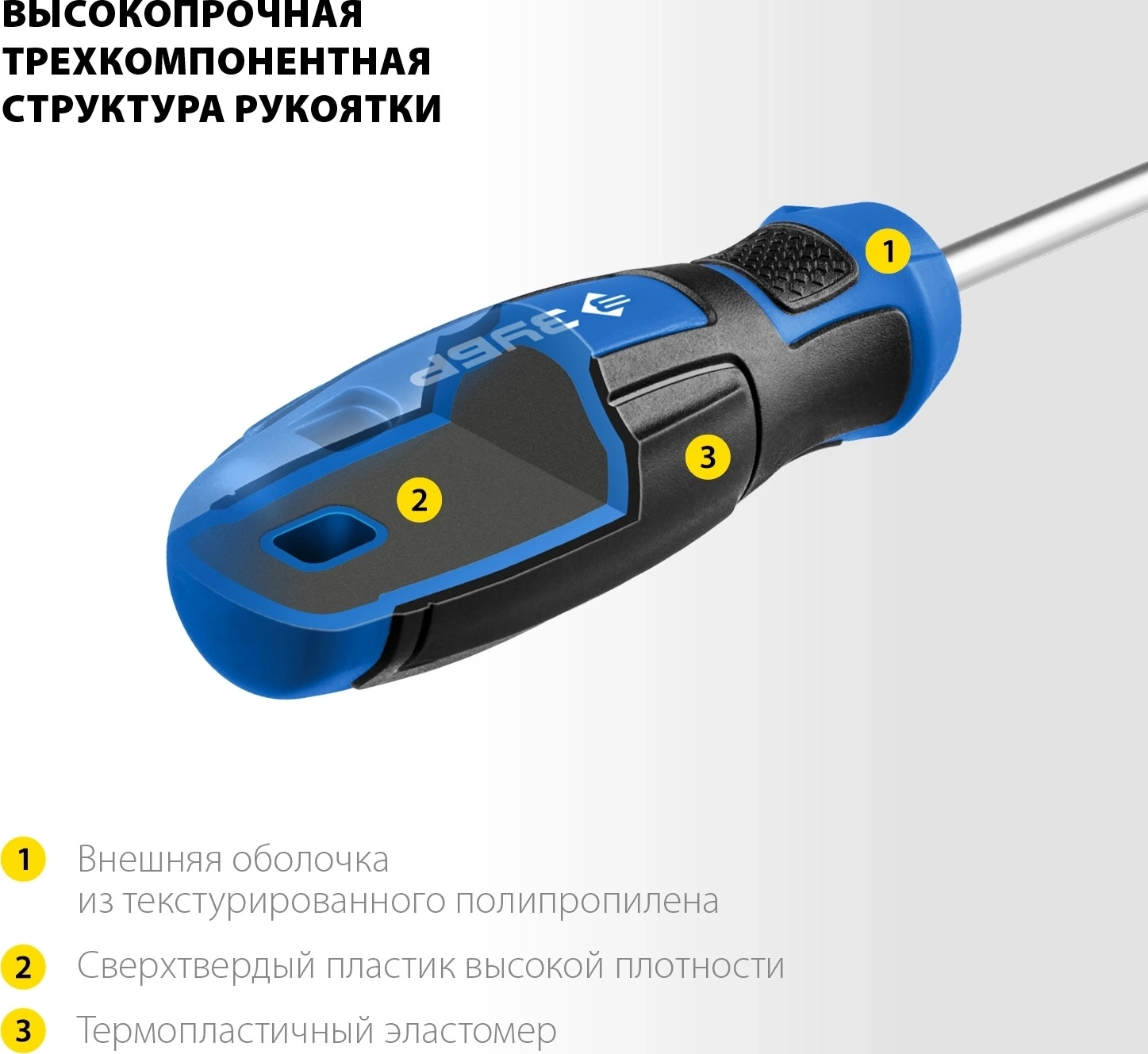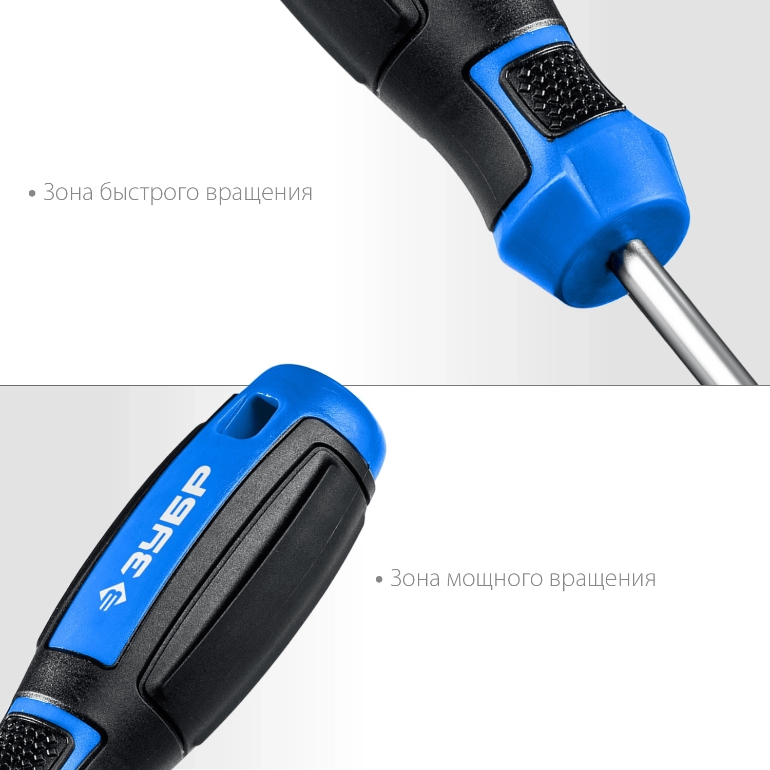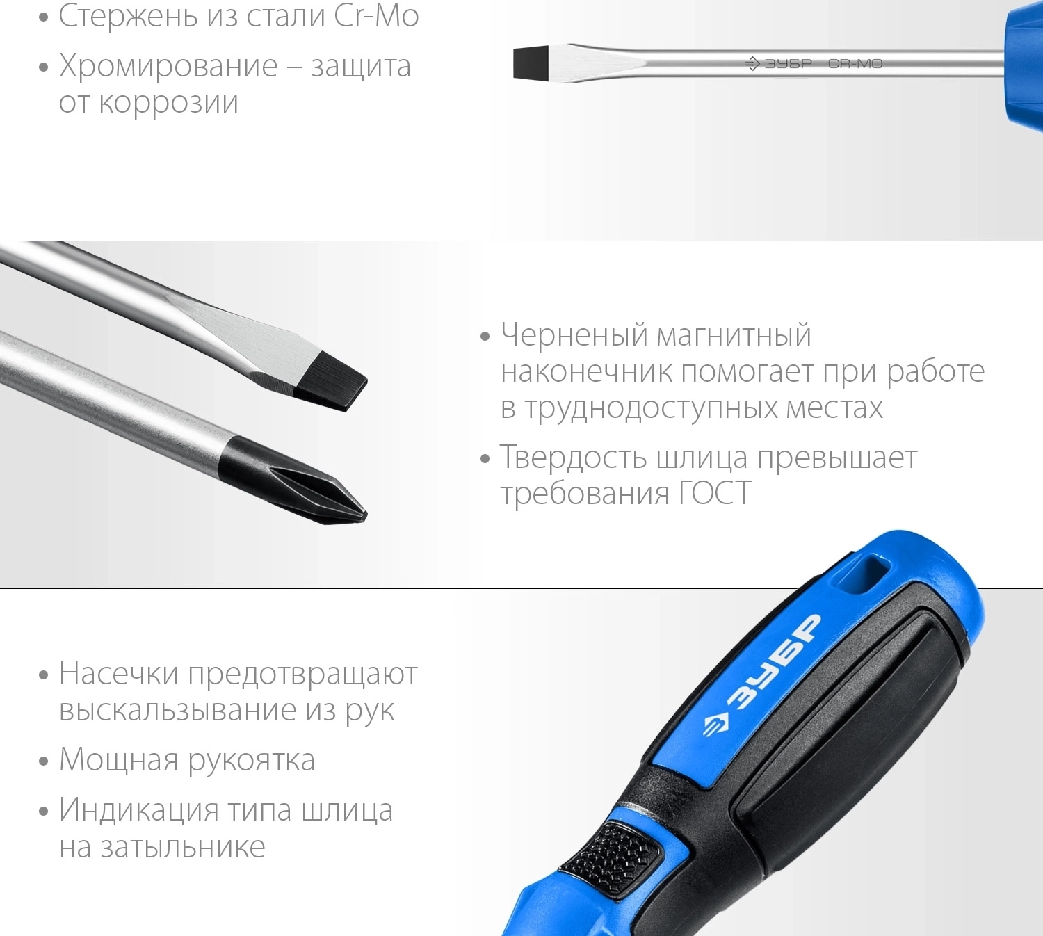 Отвертки выдерживает высокие нагрузки, благодаря высокой твердости наконечника и специальной закалке. Комфортная рукоятка обеспечивает твердый хват и удобство работы.