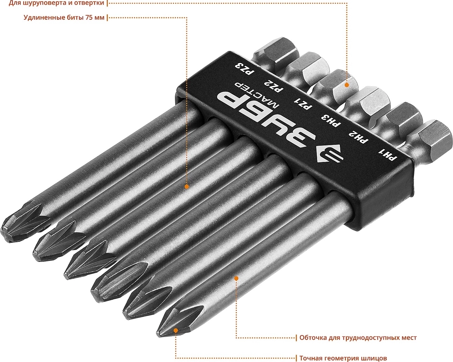Профессиональные биты ЗУБР для ручного и механизированного инструмента изготовлены из высококачественной стали и имеют точную геометрию шлицов, что обеспечивает длительный срок службы.