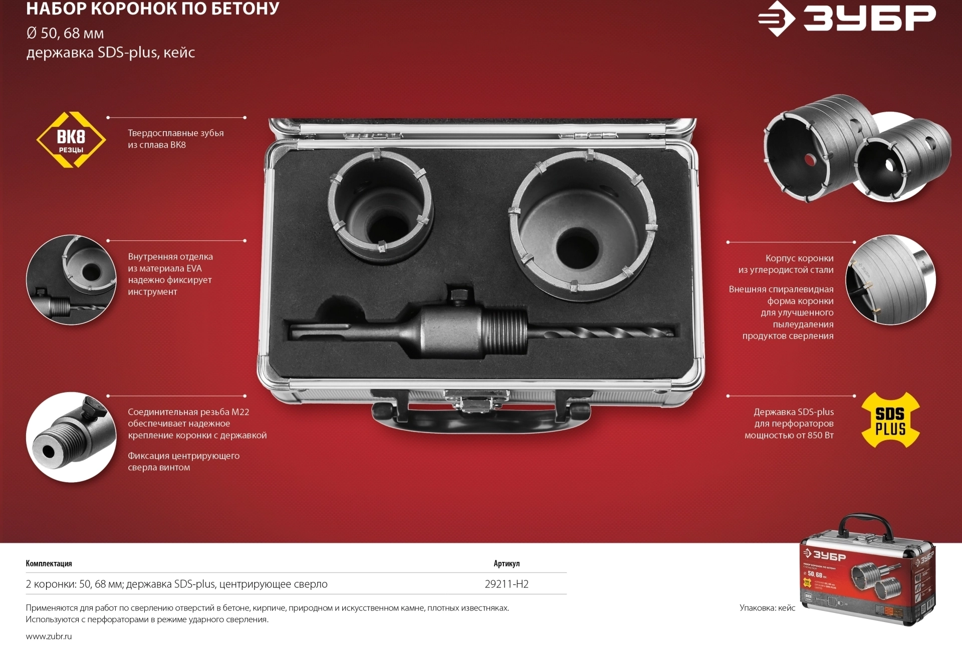 Предназначен для сверления отверстий в бетоне, кирпиче, природном и искусственном камне, а также плотных известняках. Используется с дрелями и перфораторами мощностью не менее 850 Вт в режиме ударного сверления.