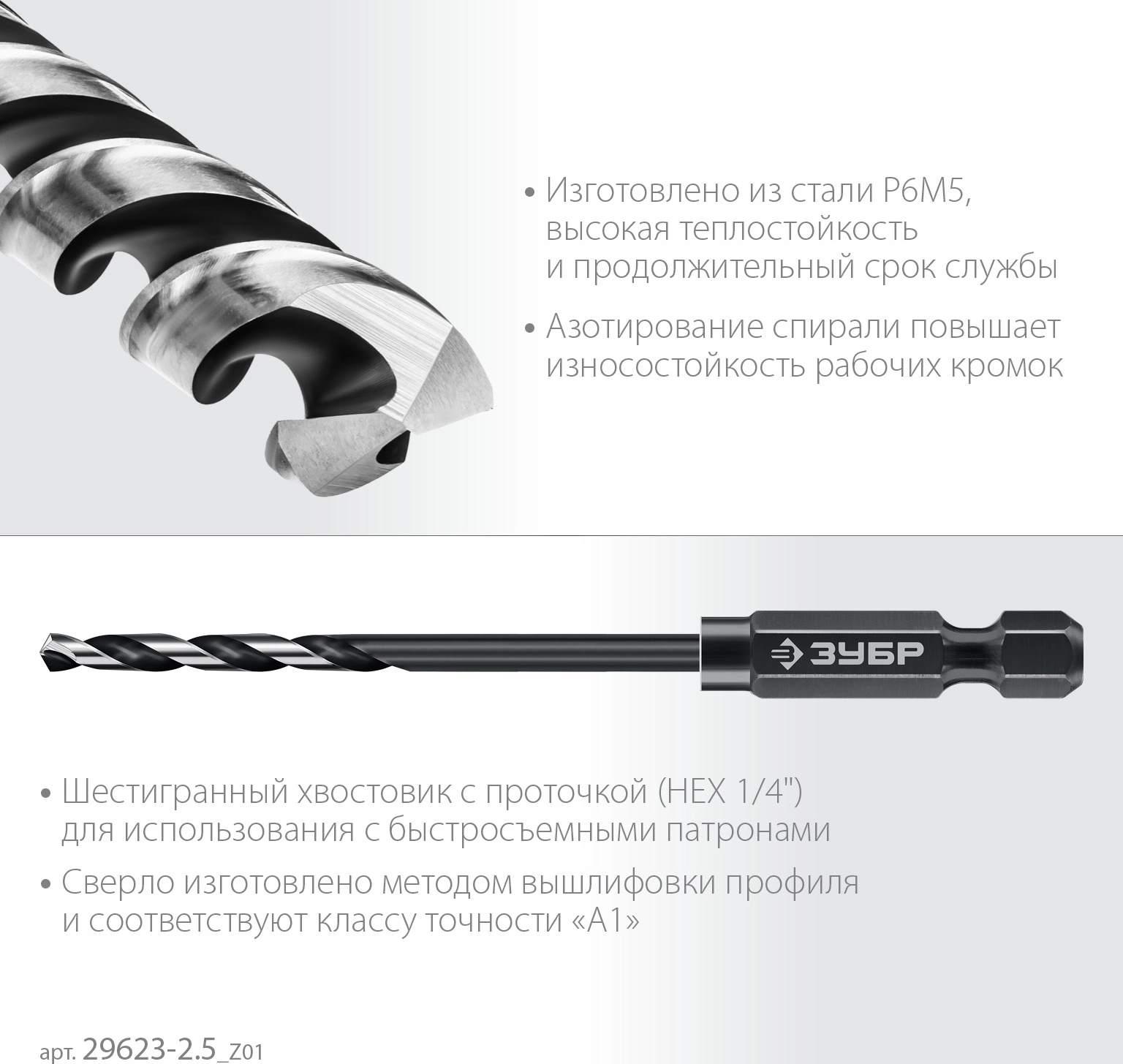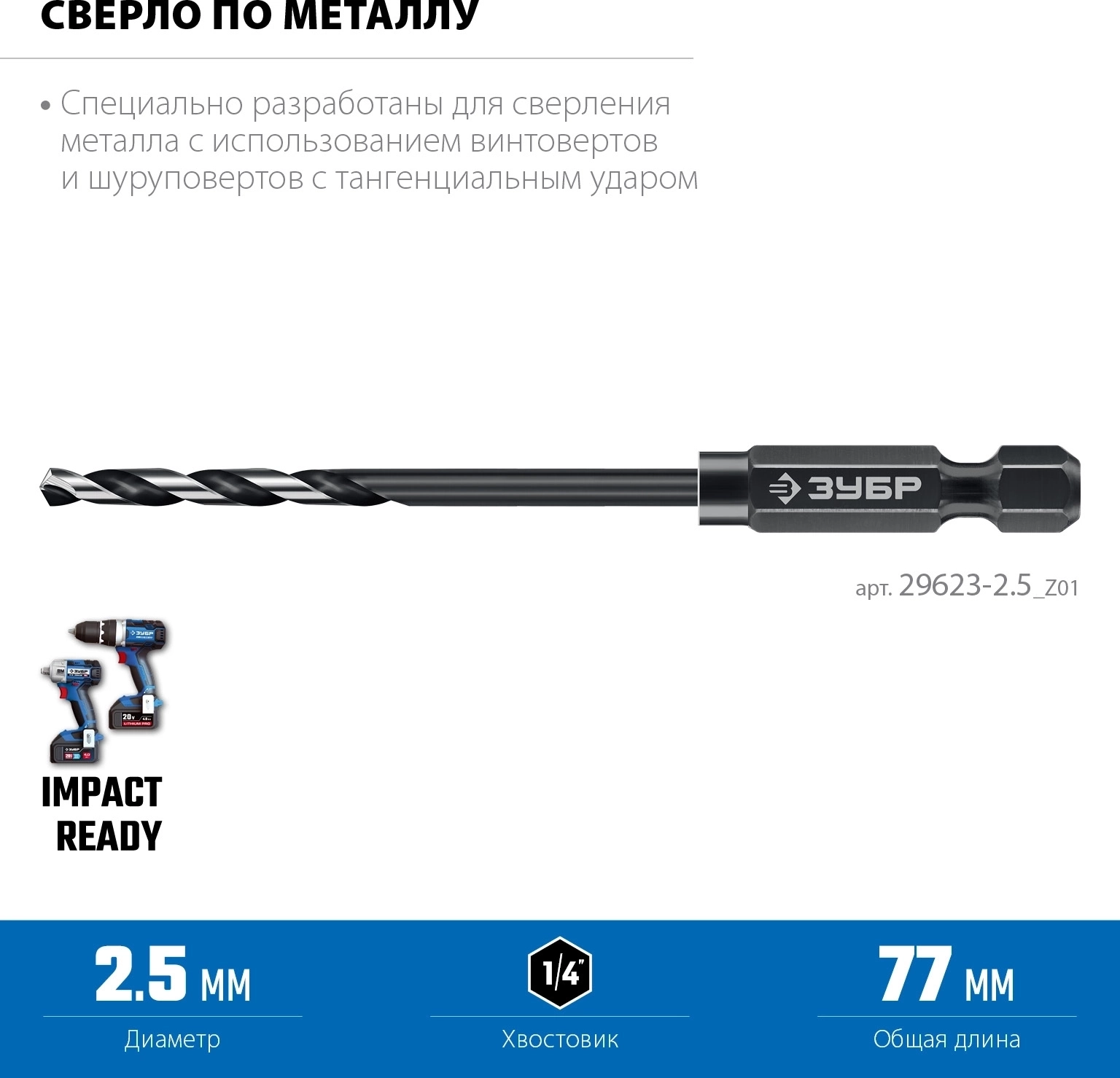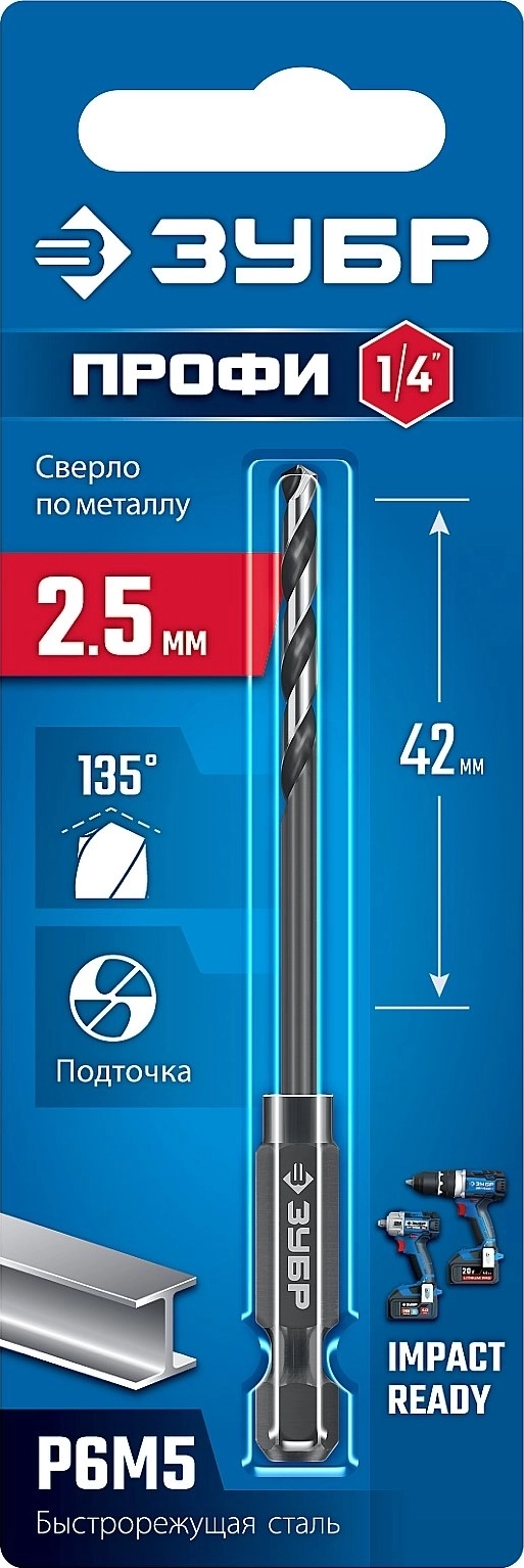 Сверло по металлу для винтовёртов и шуруповертов IMPACT READY ЗУБР НЕХ-1/4″, d 2.5 х 77 мм
