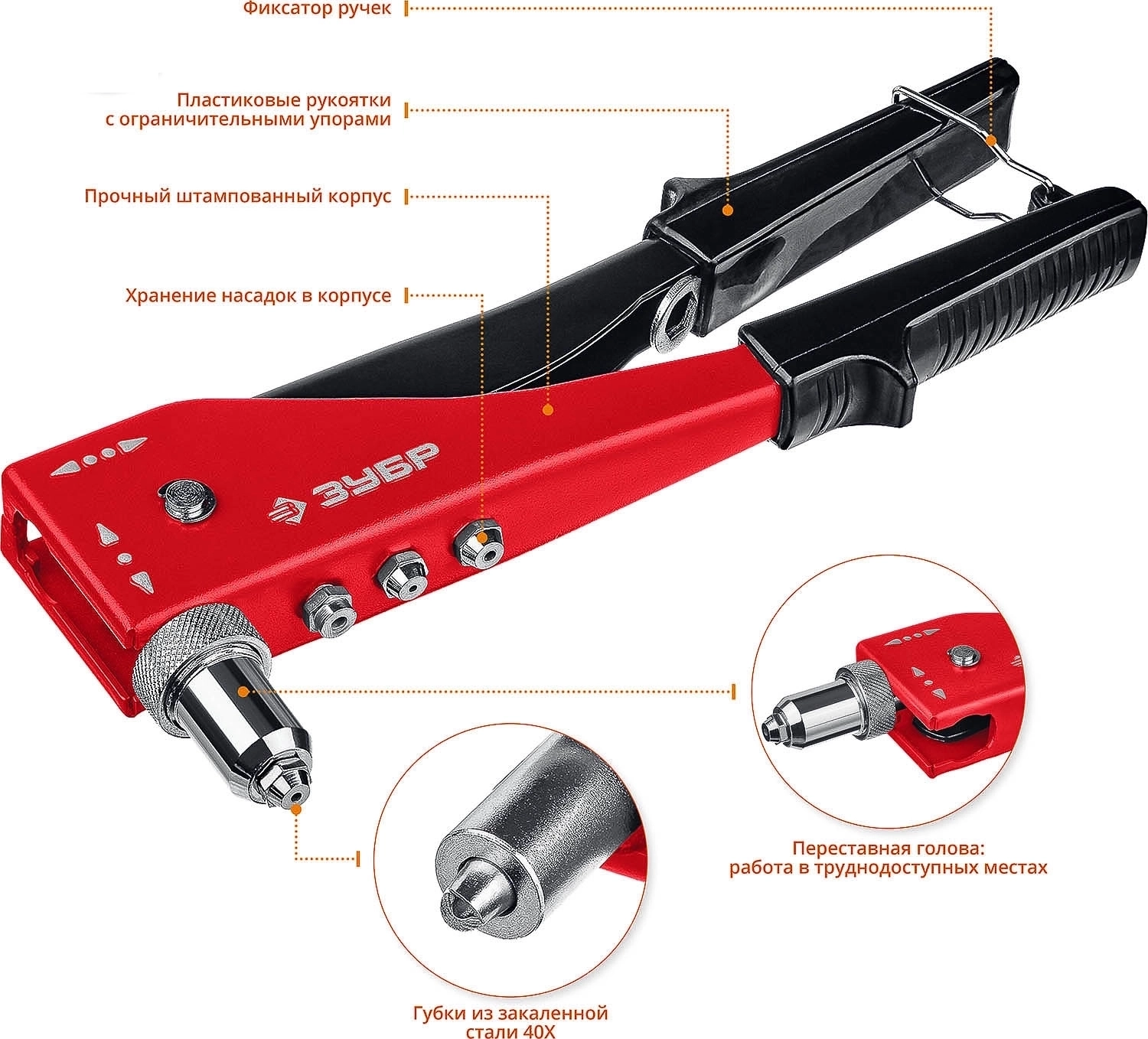 Надежный инструмент для установки вытяжных заклепок. Переставная голова облегчает работу в труднодоступных местах.