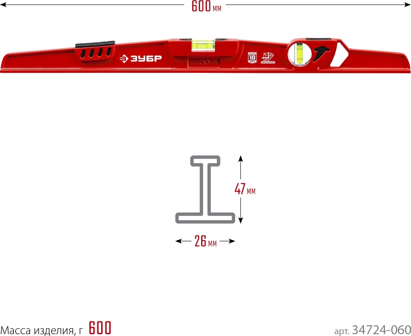Литой уровень ЗУБР РЕЛЬС, 600 мм, двутавровый, с перископом