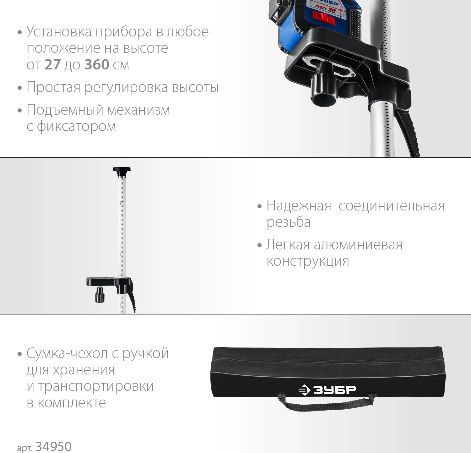 Профессиональный инструмент для работы с лазерным, оптическим и фотоинструментом, там где требуется разметка на большой высоте. Выполнена из алюминиевого сплава, благодаря чему имеет небольшой вес. А за счёт разборной конструкции штангу легко носить и легко с ней работать.