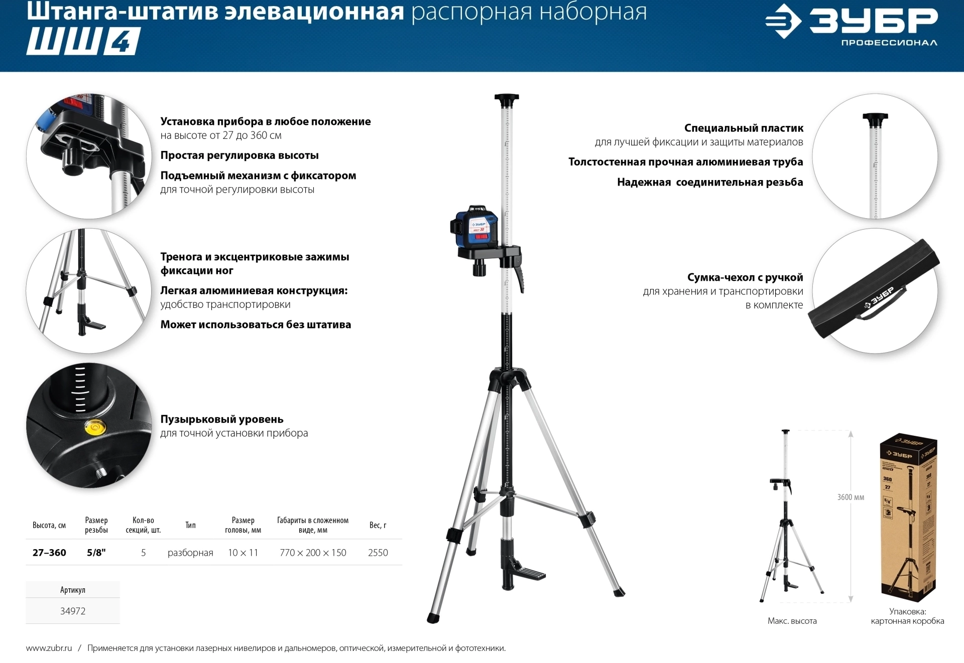 Профессиональный инструмент для работы с лазерным, оптическим и фотоинструментом, там где требуется разметка на большой высоте. Выполнена из алюминиевого сплава, благодаря чему имеет небольшой вес. А за счёт разборной конструкции штангу легко носить и легко с ней работать.