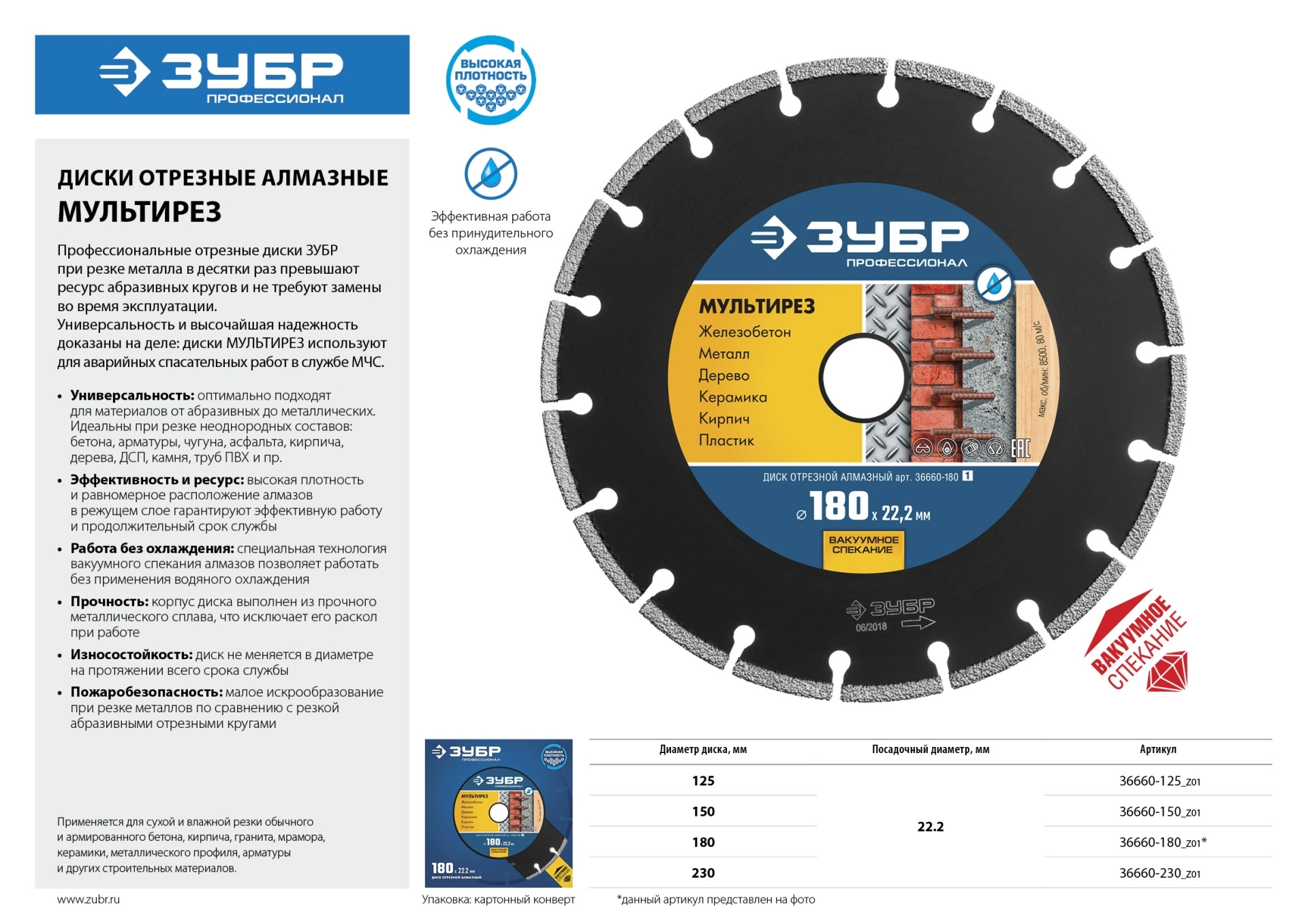 - Новейшая технология ВВС (Высокотемпературное Вакуумное Спекание алмазов) позволяет использовать диск для резки различных материалов, в том числе металлов без обязательного водяного охлаждения.