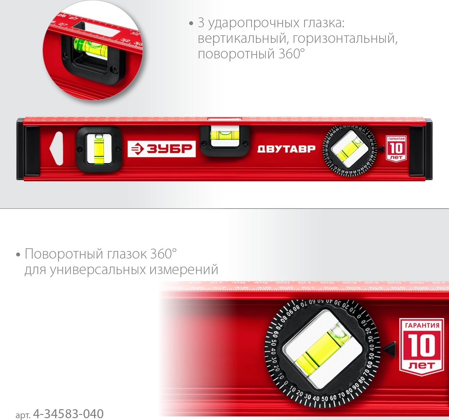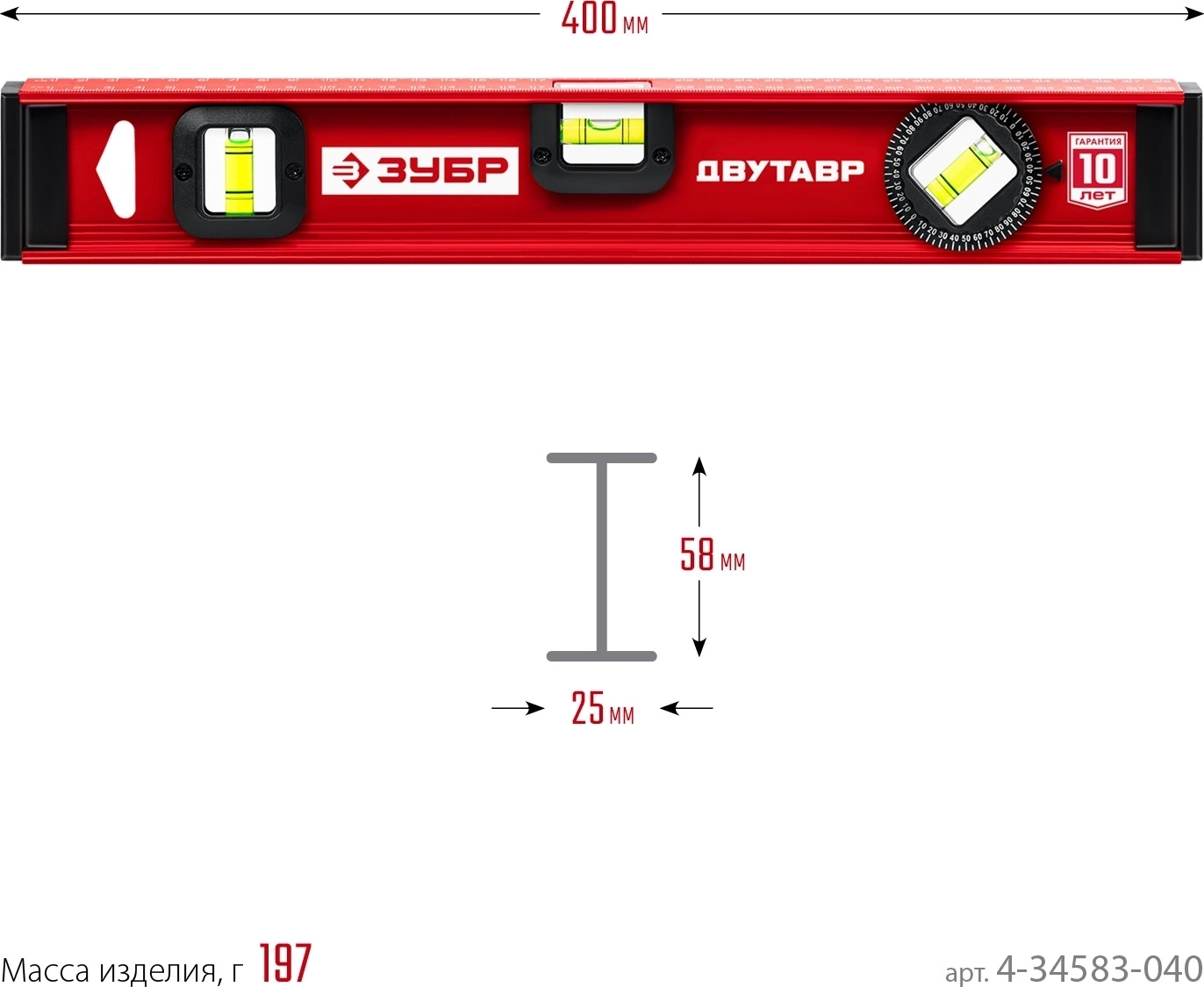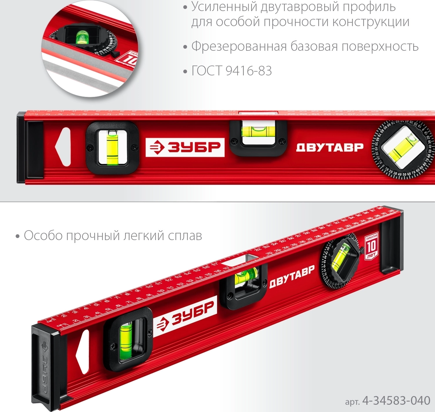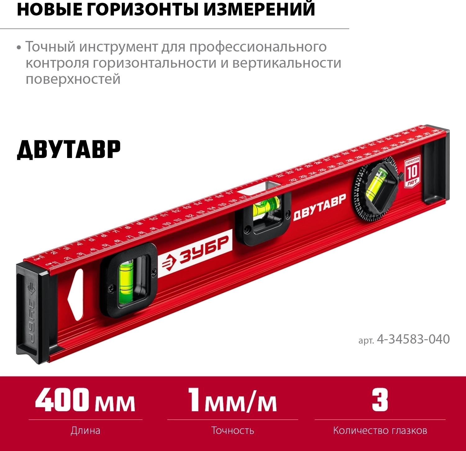Уровень с усиленным профилем ЗУБР ДВУТАВР, 400 мм, двутавровый