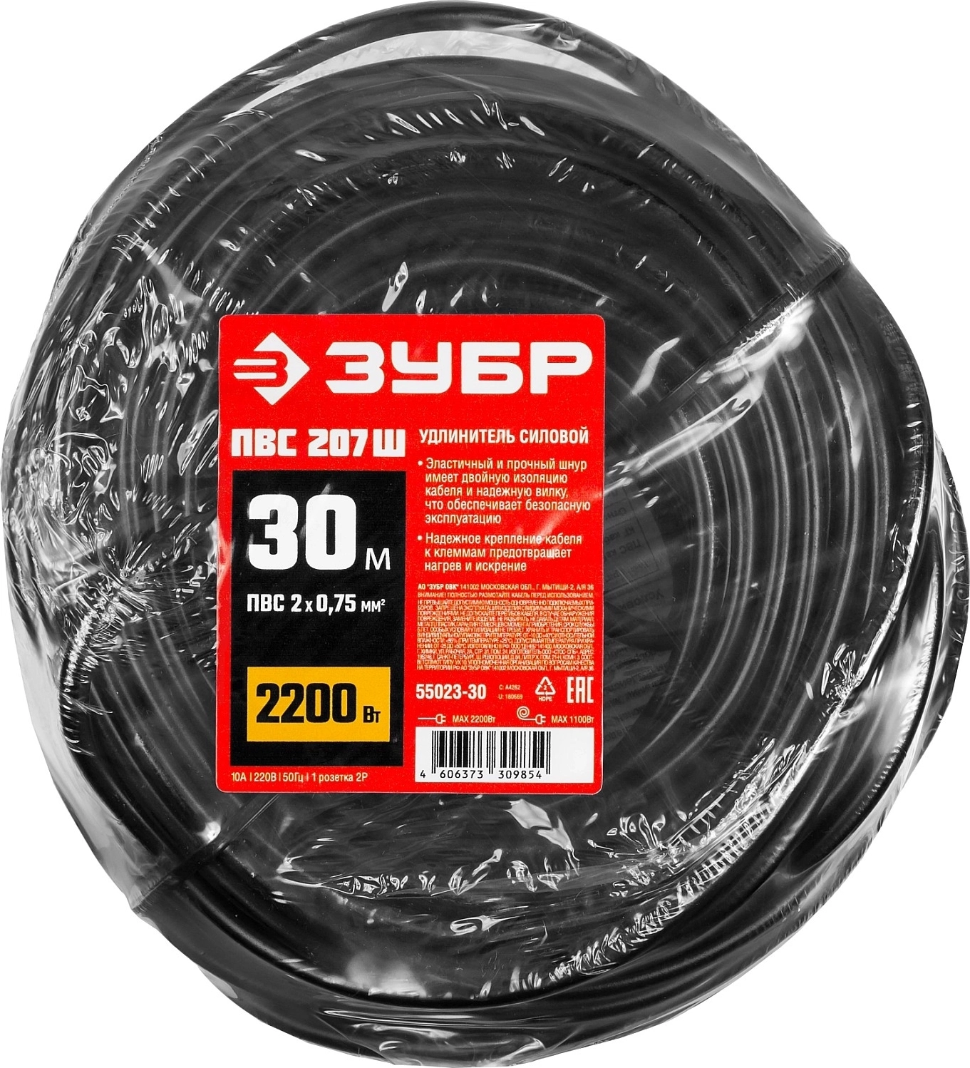 Силовой удлинитель-шнур ЗУБР ПВС-207-Ш, ПВС, 2 x 0.75 мм2, 30 м, 2200 Вт