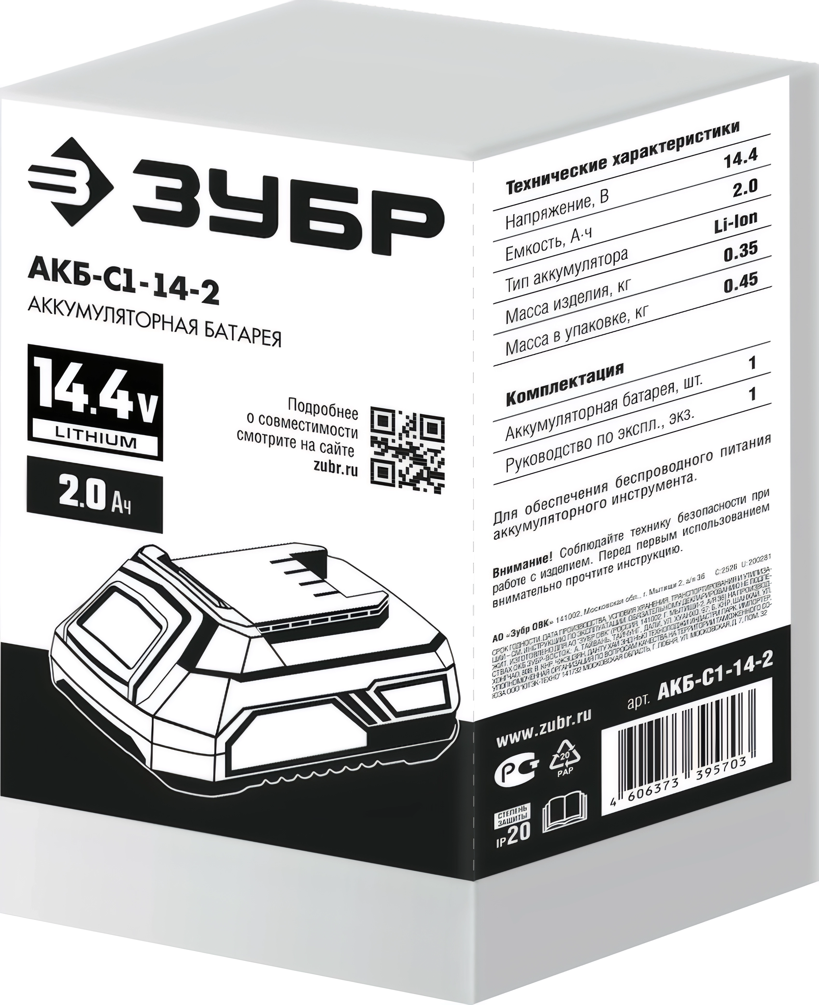 Аккумуляторная батарея ЗУБР С1, 14.4 В, 2.0 А·ч