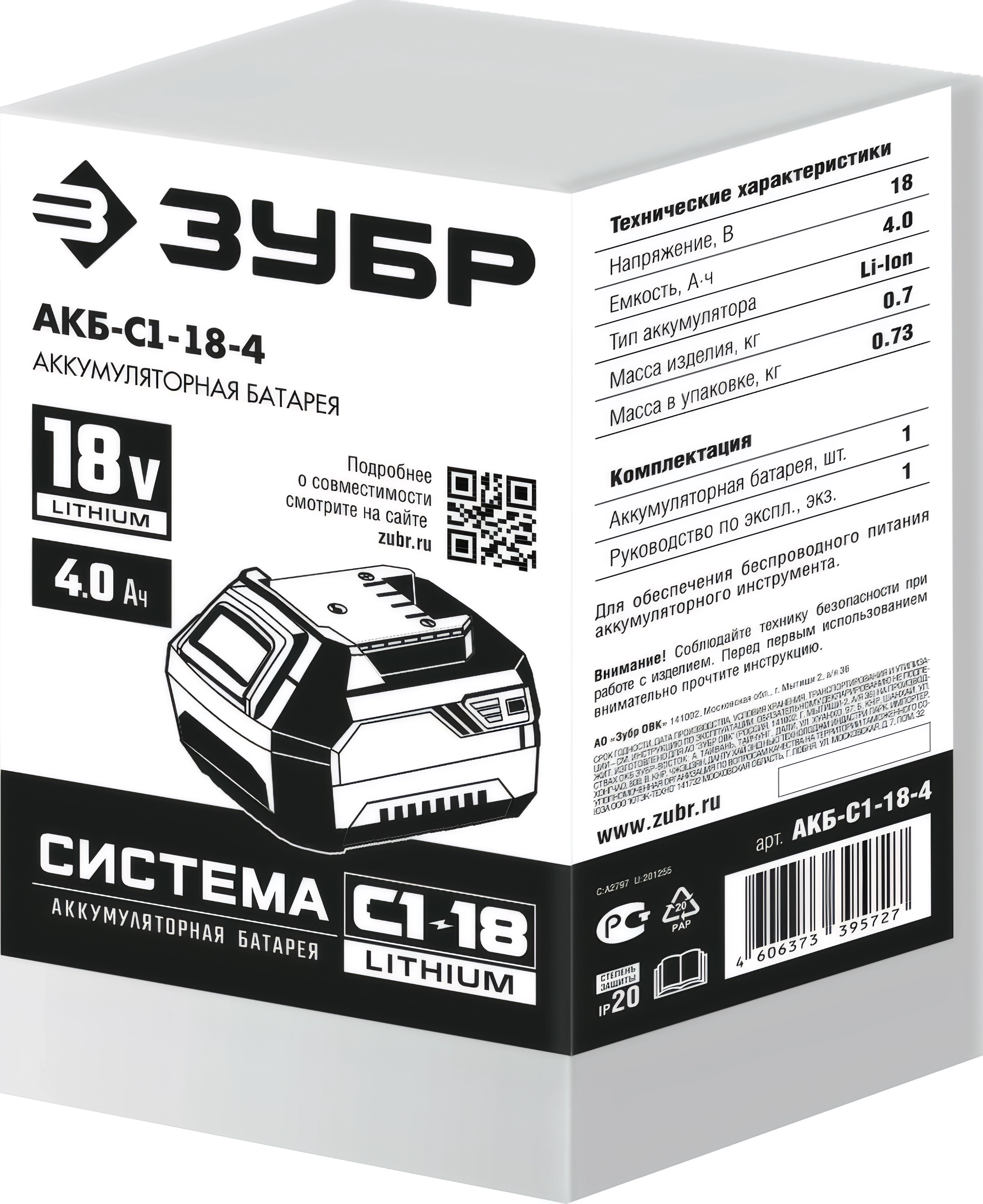 Аккумуляторная батарея ЗУБР С1-18, 18 В, 4.0 А·ч