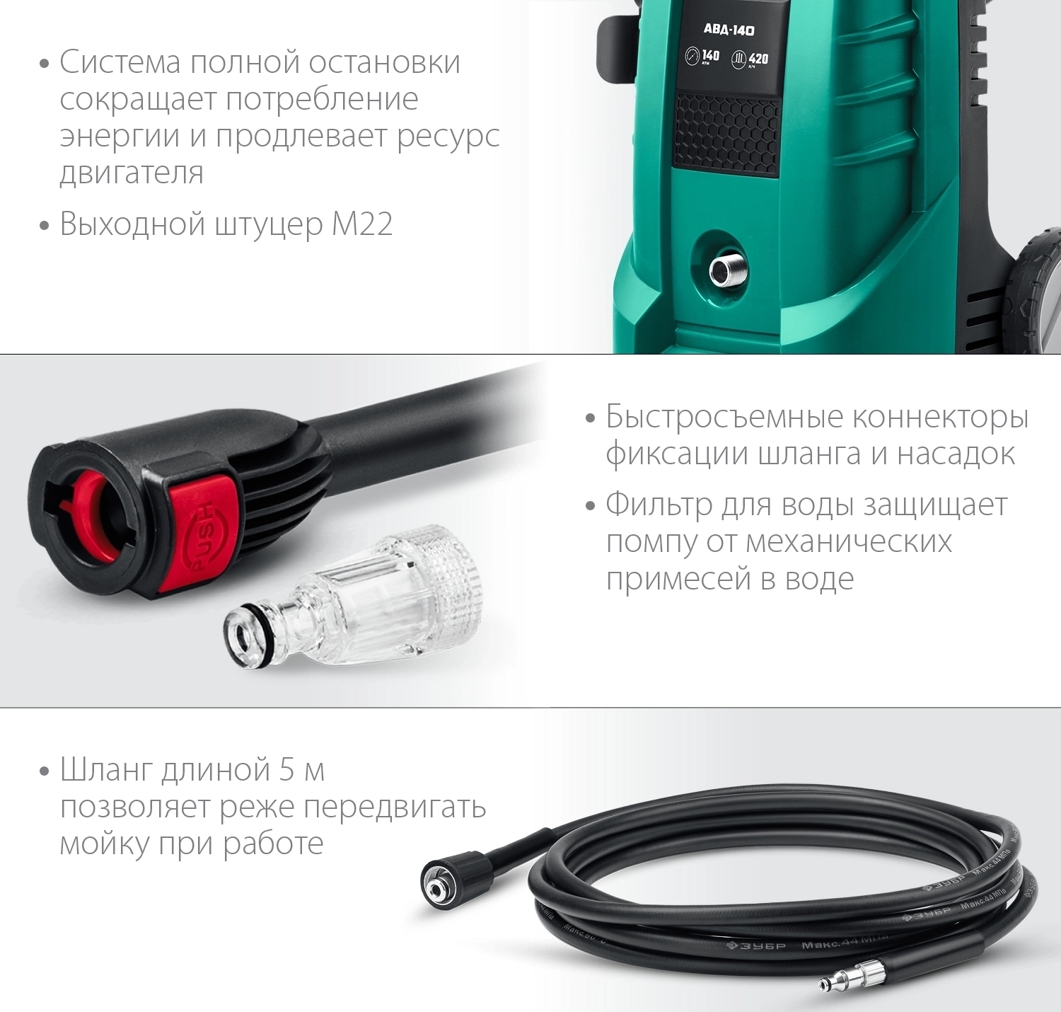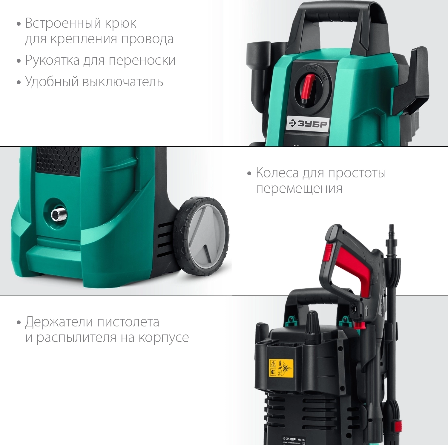 Мощное изделие для удаления любых загрязнений при помощи струи воды высокого давления. Благодаря системе полной остановки, помпа не работает при ненажатом пистолете – это экономит воду и ресурс изделия при неизбежных паузах в работе. Элегантный дизайн и удобная конструкция с держателями для аксессуаров делают работу с изделием комфортной. Регулировка выходной струи позволяет обрабатывать различные поверхности - автомобили, стены, велосипеды, напольные покрытия и т.п.
