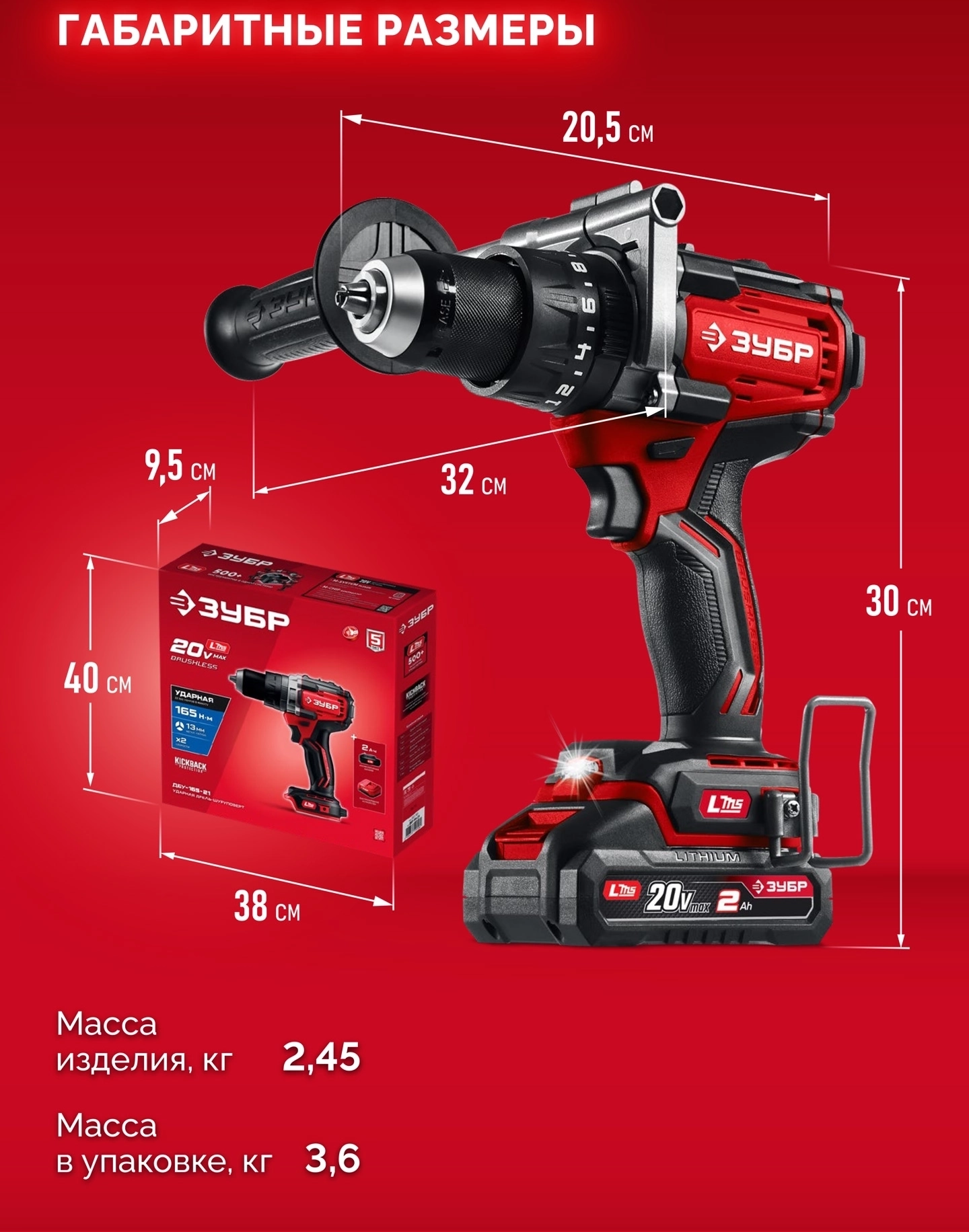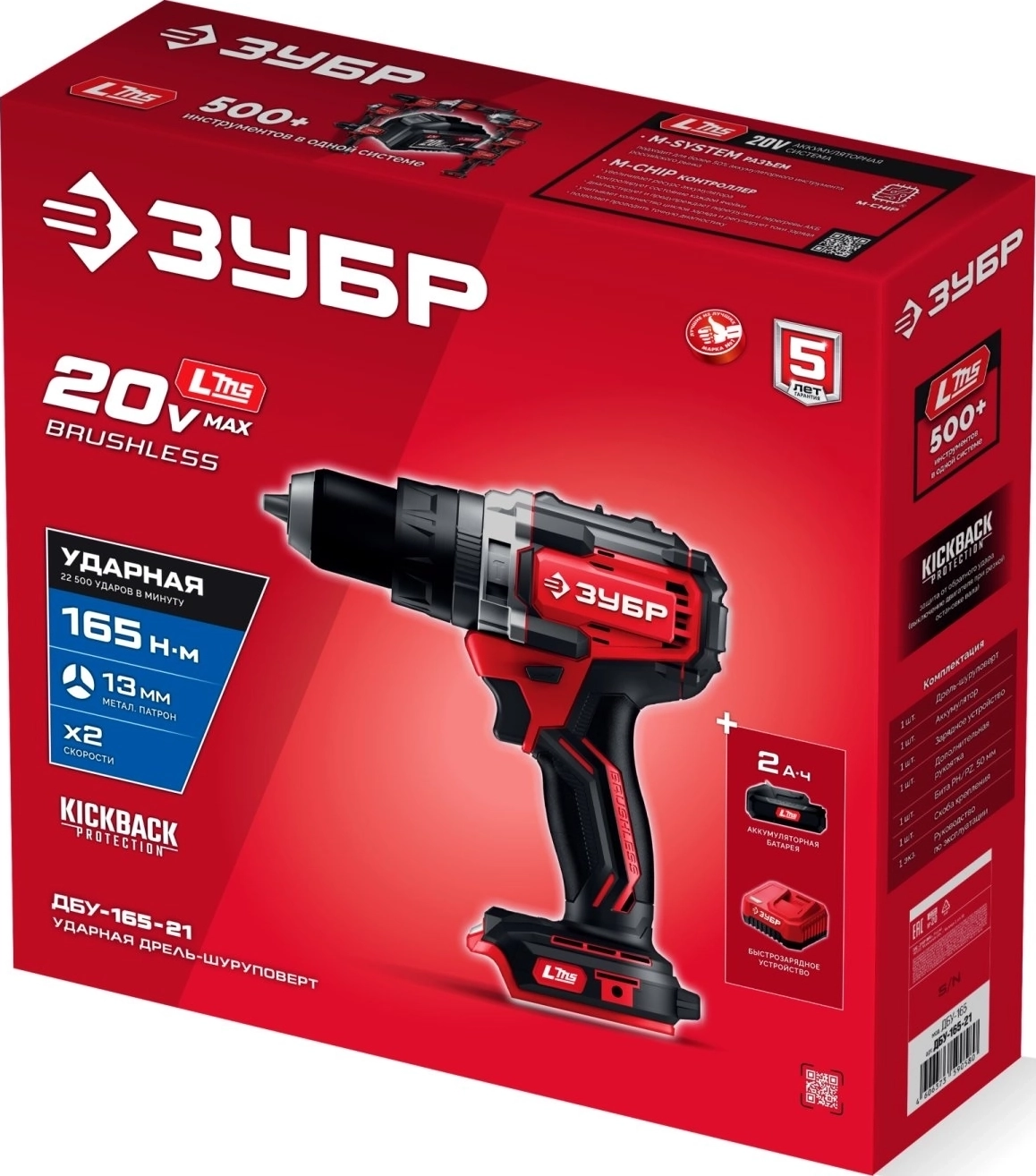 Бесщеточная ударная дрель-шуруповерт ЗУБР 20 В, 165 Н·м, 1 АКБ LMS (2 А·ч)