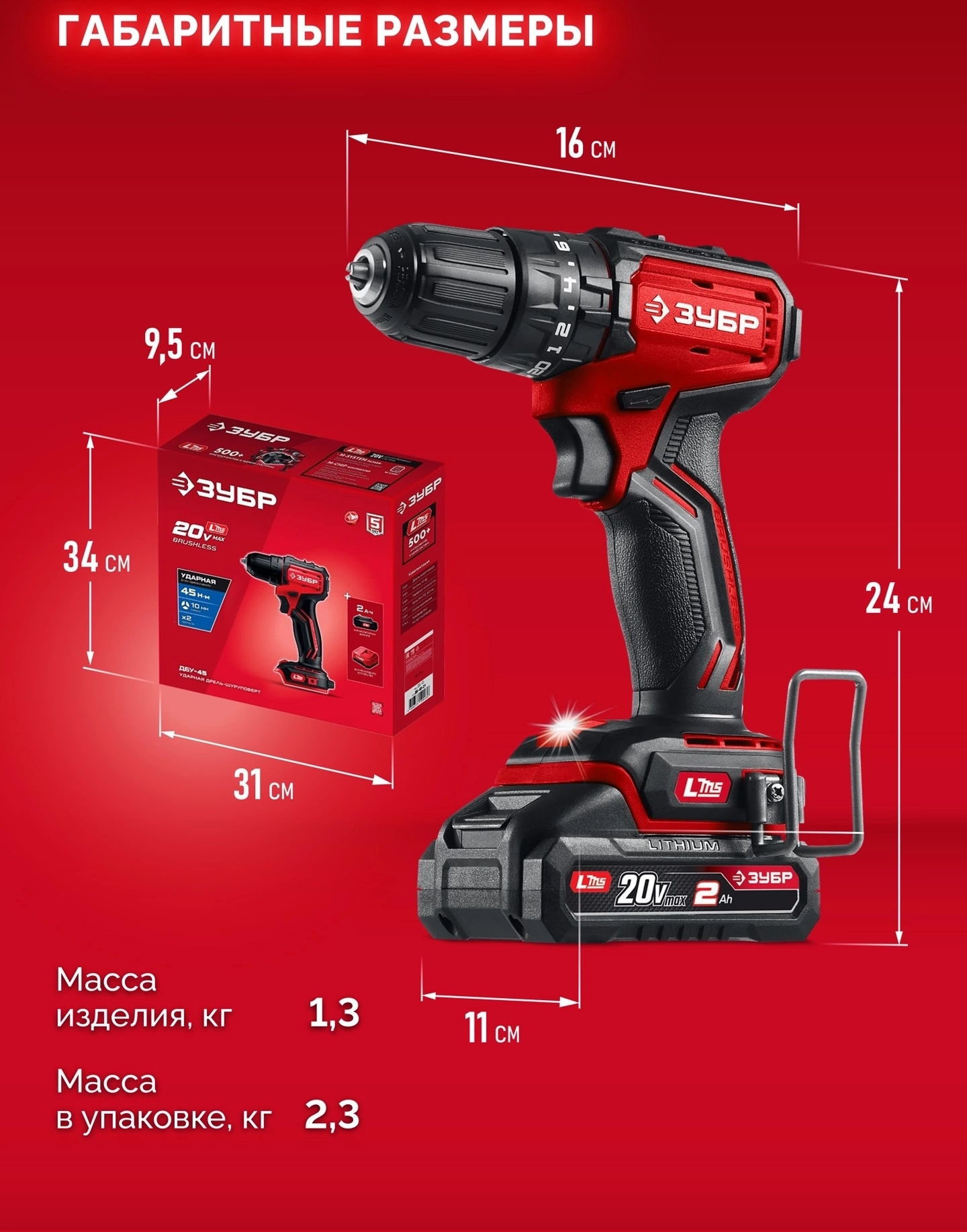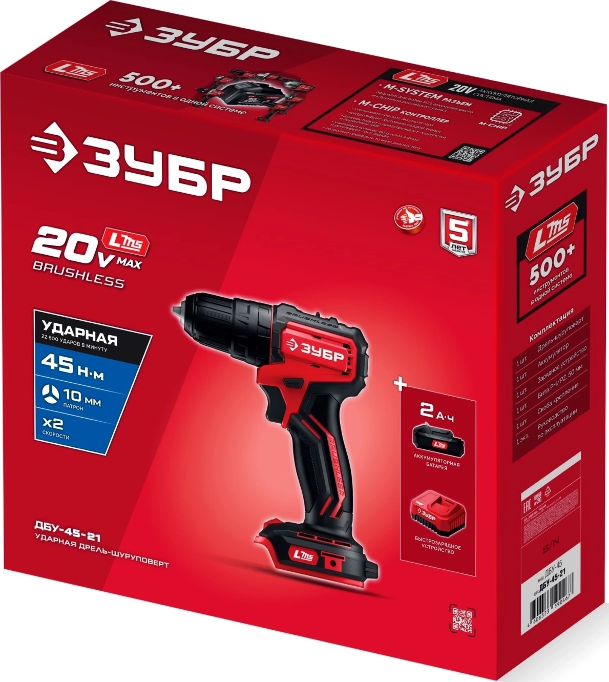 Бесщеточная ударная дрель-шуруповерт ЗУБР 20 В, 45 Н·м, 1 АКБ LMS (2 А·ч)
