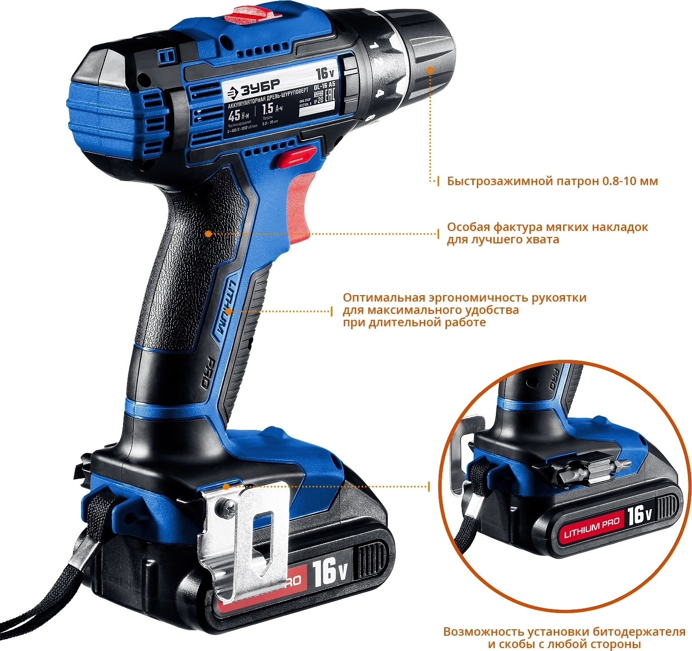 - Скоба крепления на поясе и битодержатель устанавливаются с любой стороны инструмента