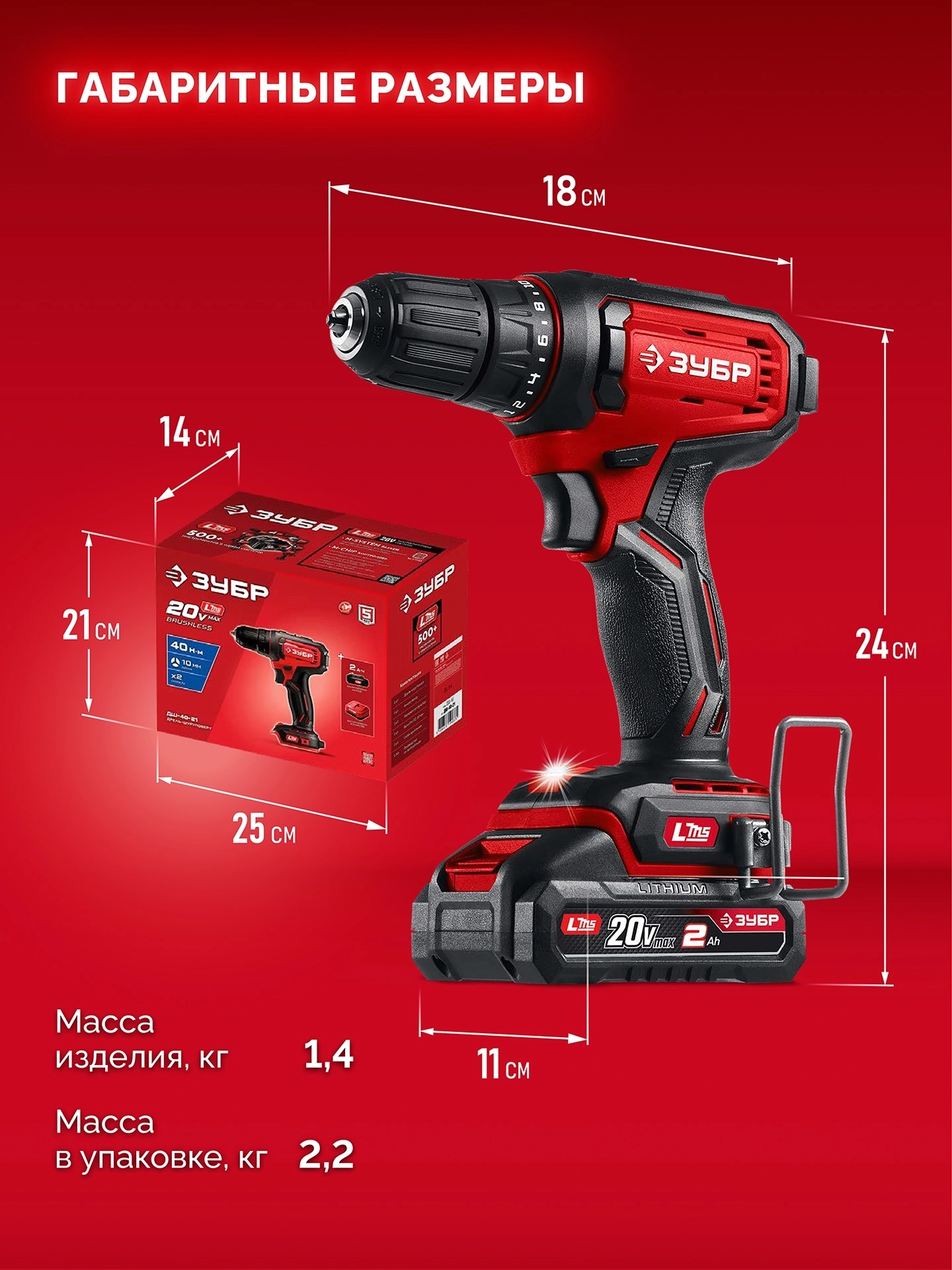 Дрель-шуруповерт ЗУБР 20 В, 40 Н·м, 1 АКБ LMS (2 А·ч)