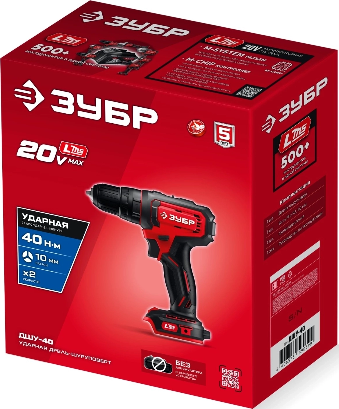 Ударная дрель-шуруповерт ЗУБР 20 В, 40 Н·м, без АКБ (LMS)