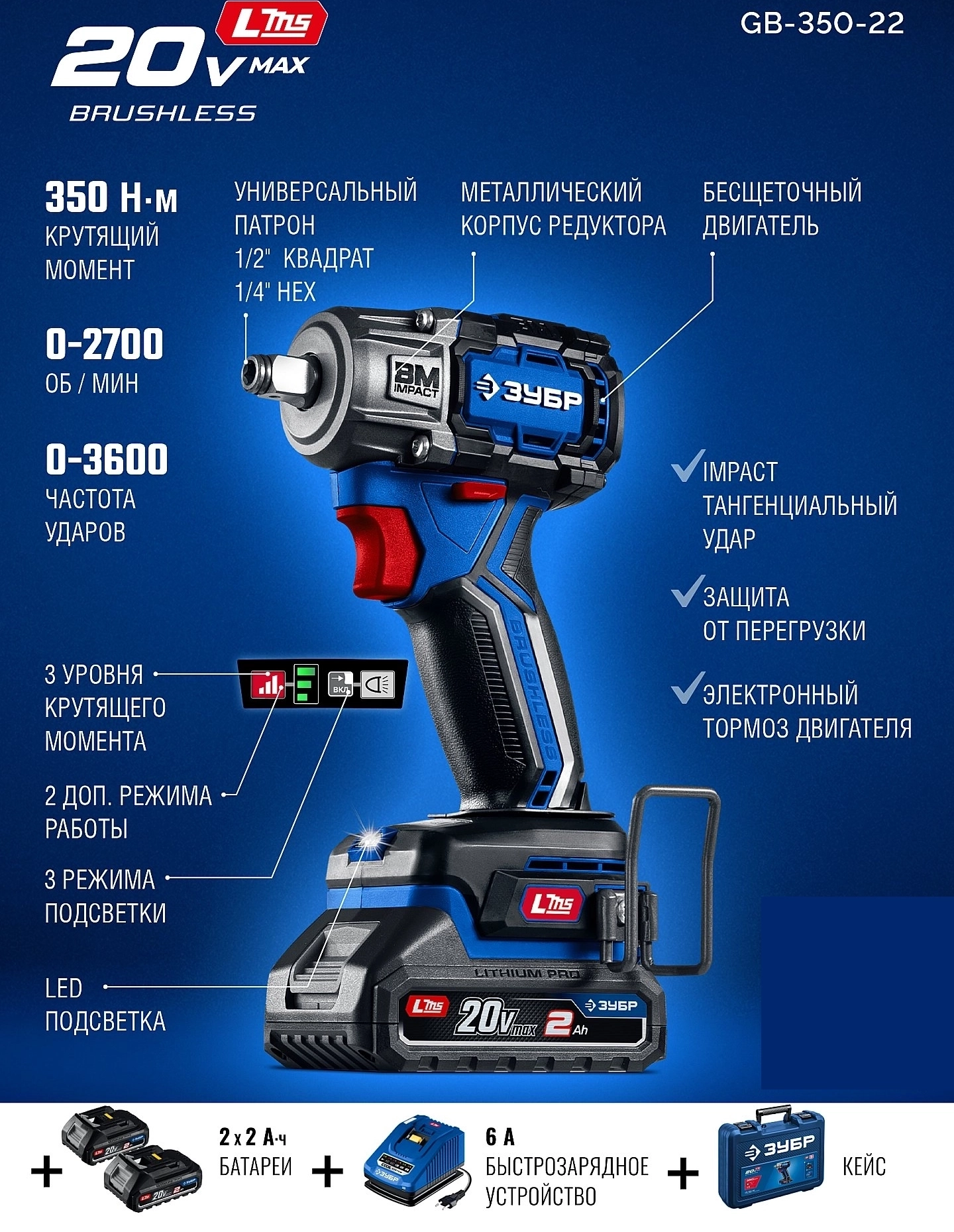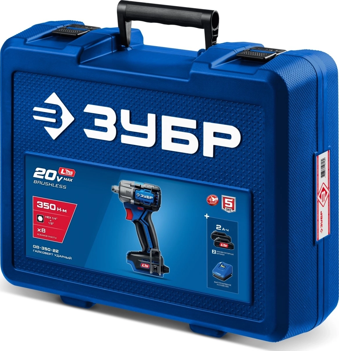 ПРОФЕССИОНАЛ ЗУБР 20 В, 350 Н·м, 2 АКБ LMS (2 А·ч), бесщеточный ударный гайковерт, кейс