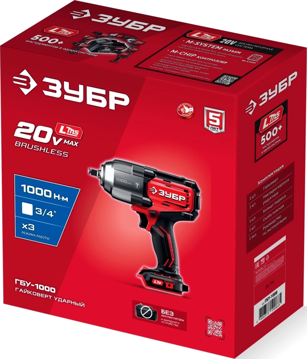 Бесщеточный ударный гайковерт ЗУБР 20 В, 1000 Н·м, без АКБ (LMS)
