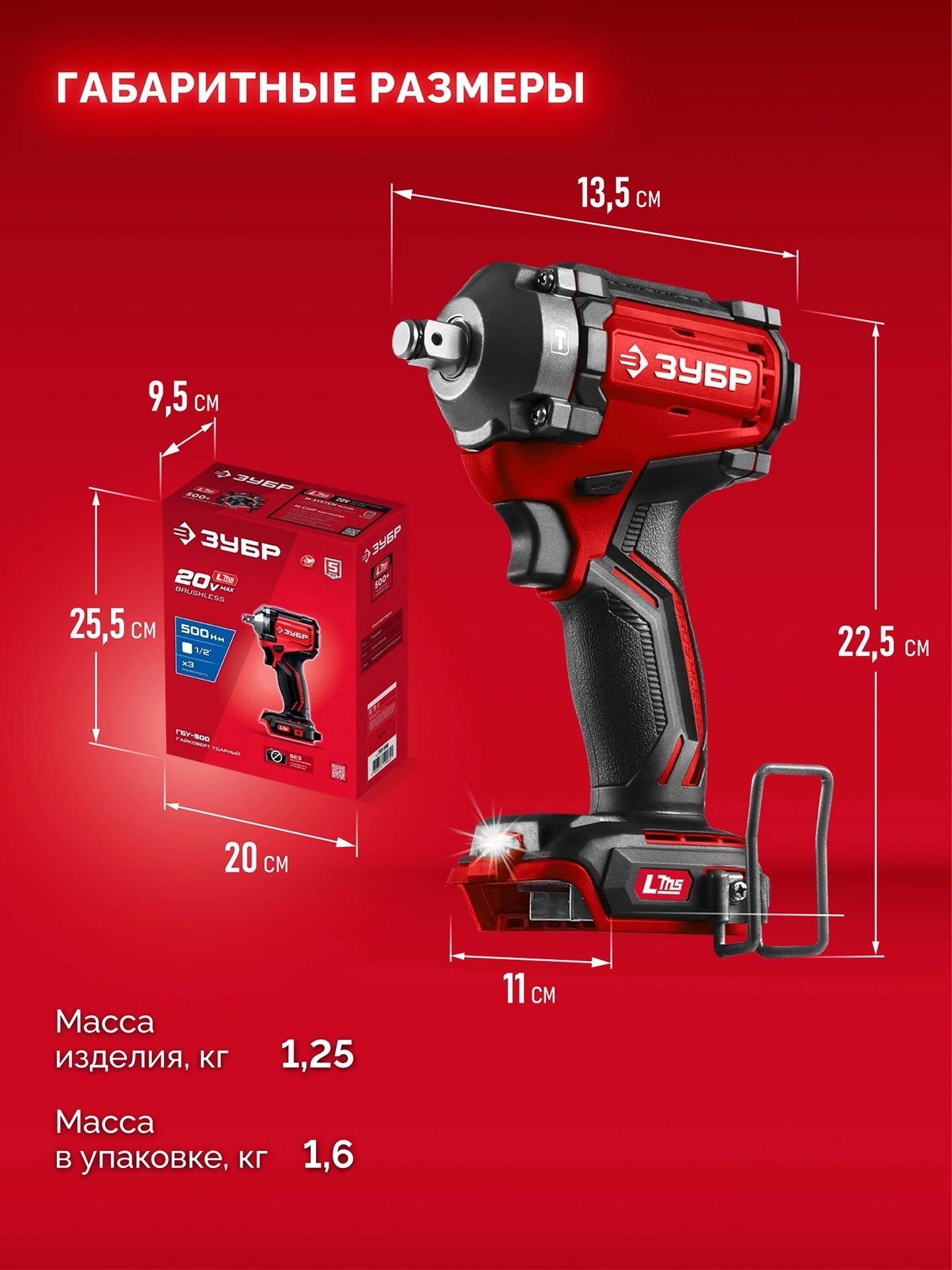 Бесщеточный ударный гайковерт ЗУБР 20 В, 500 Н·м, без АКБ (LMS)