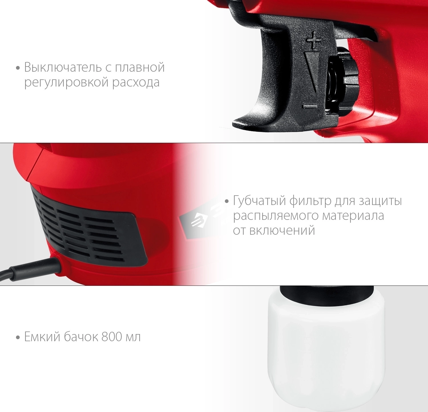- Расходная емкость объемом 800 мл позволяет длительно работать на одной заправке и не нагружает руки оператора излишним весом