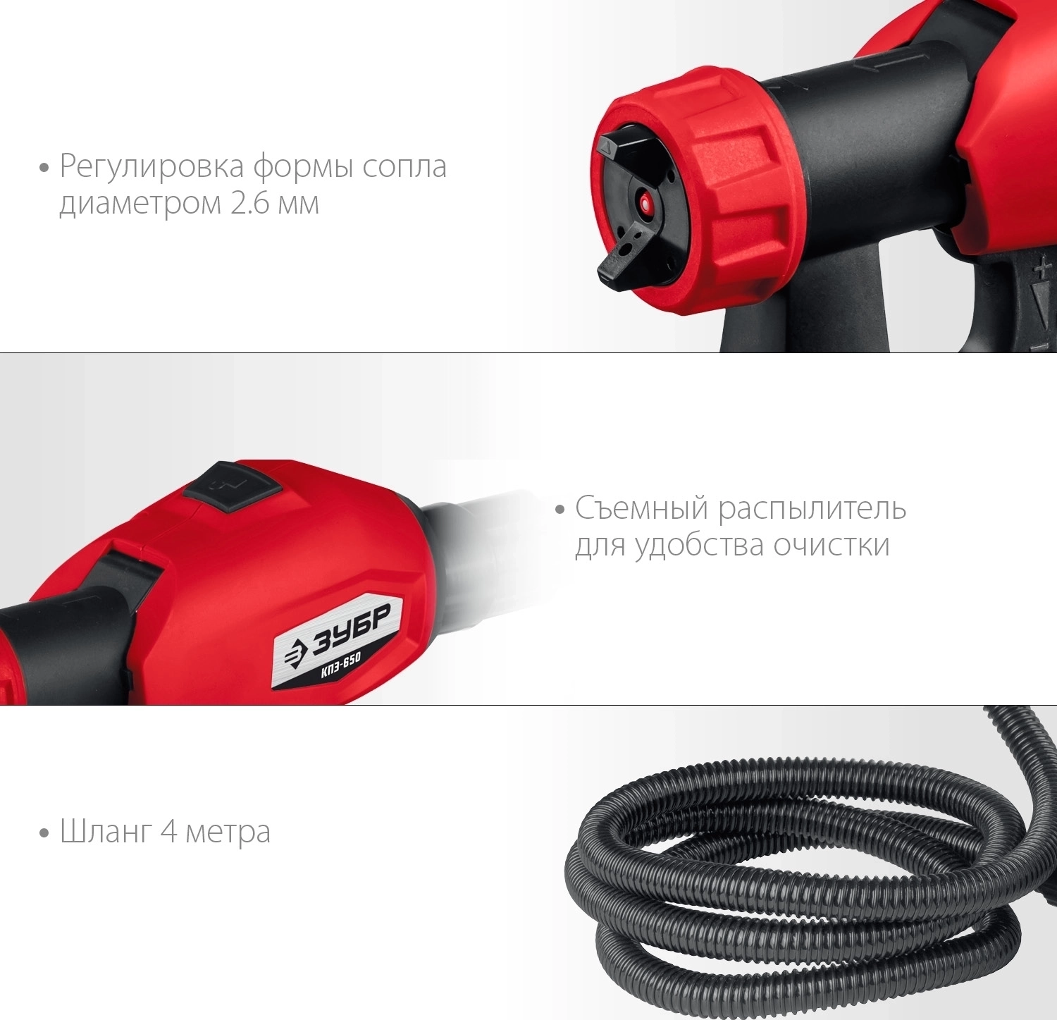 - Регулировка формы сопла для горизонтальной и вертикальной окраски, а также для труднодоступных поверхностей