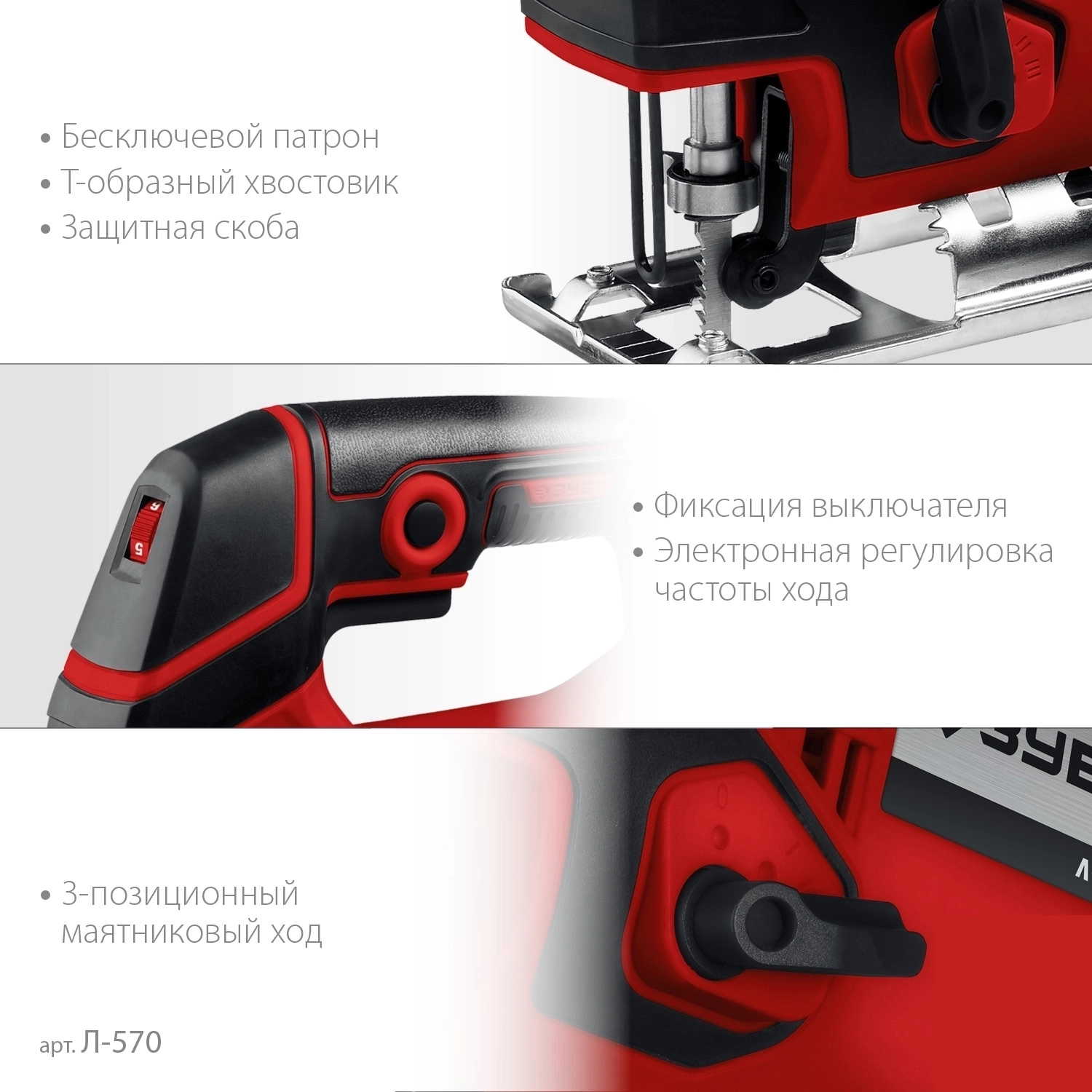 - 3-позиционный маятниковый ход для обеспечения как быстрого, так и чистого пиления