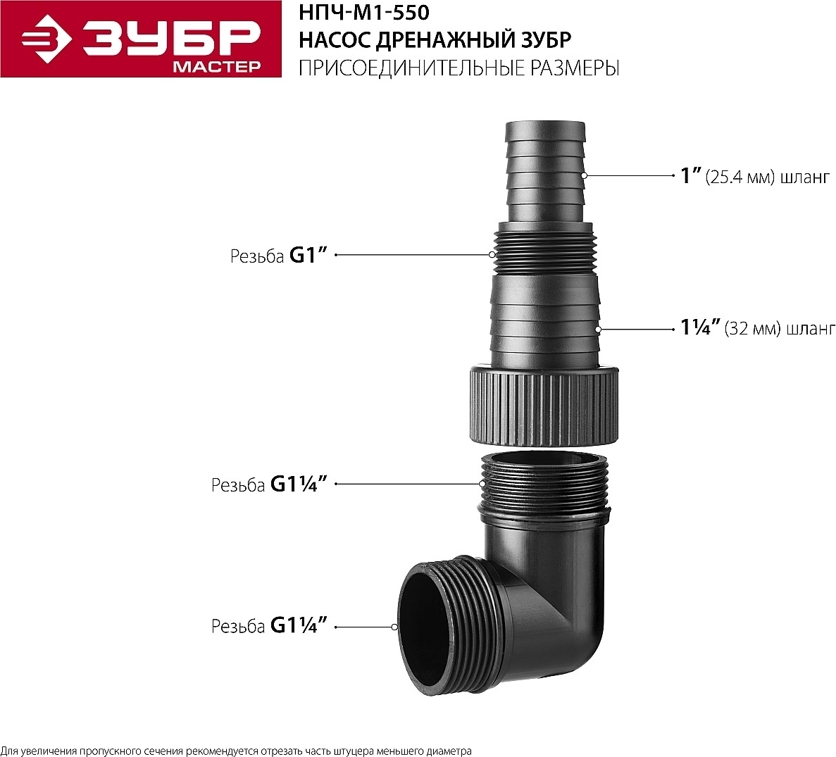 - Универсальный соединительный штуцер от 1'' до 1 1/4'' для шлангов и от G1″ до G1 1/4″ для трубопроводов