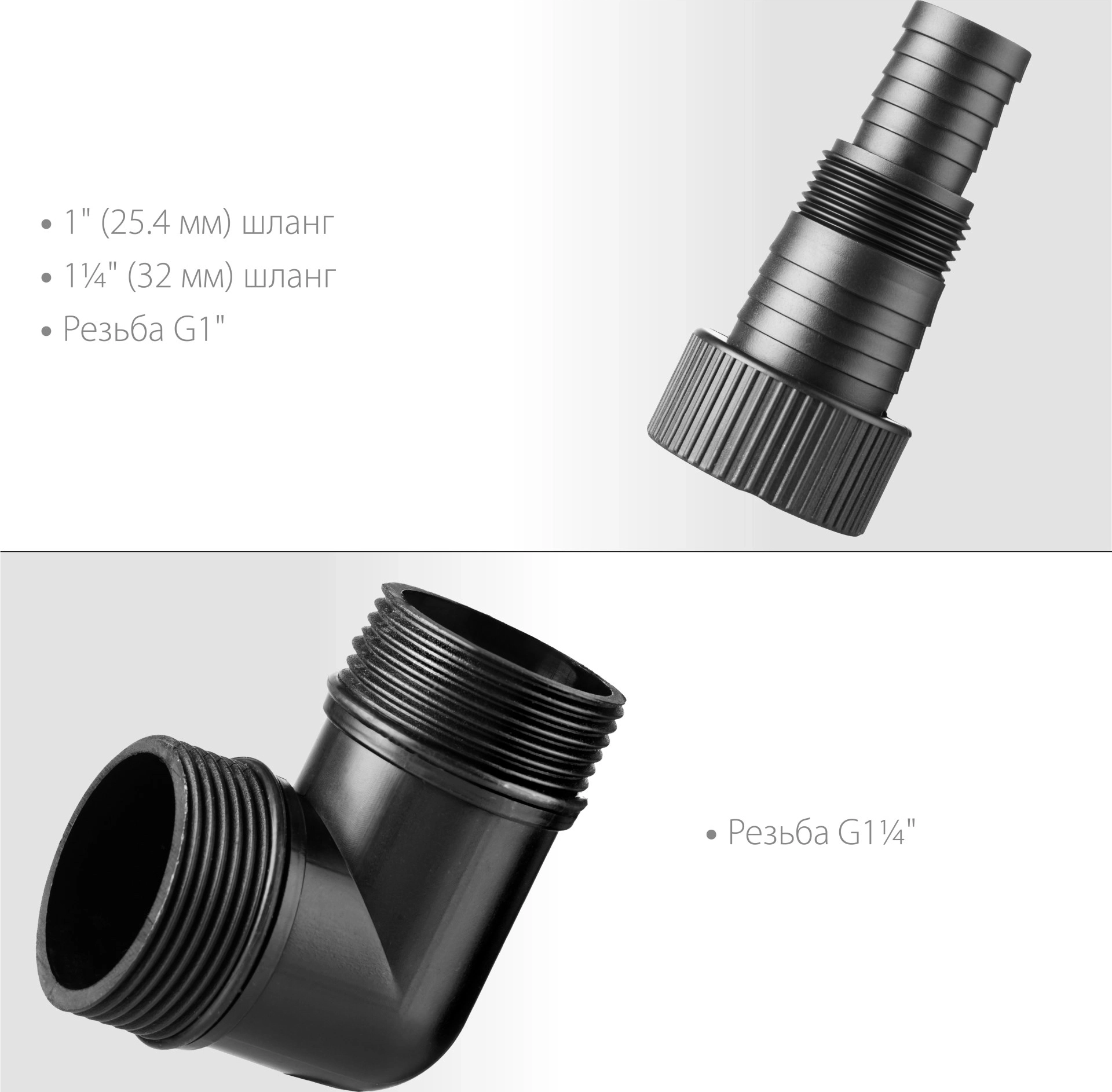 - Универсальный соединительный штуцер от 1'' до 1 1/4'' для шлангов и от G1″ до G1 1/4″ для трубопроводов