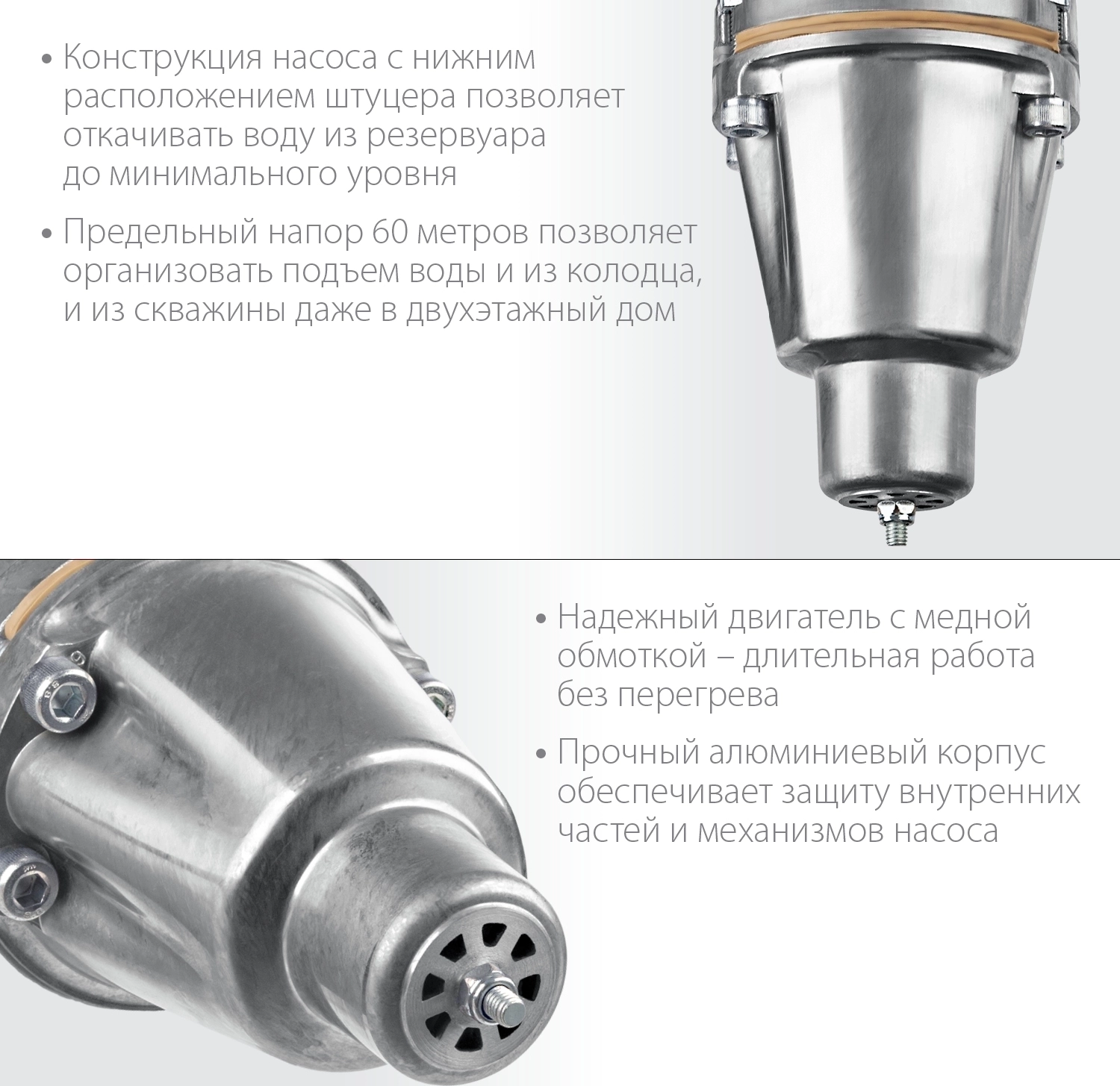 - Предельный Напор 60 метров позволяет организовать подъем воды и из колодца, и из скважины даже в двухэтажный дом