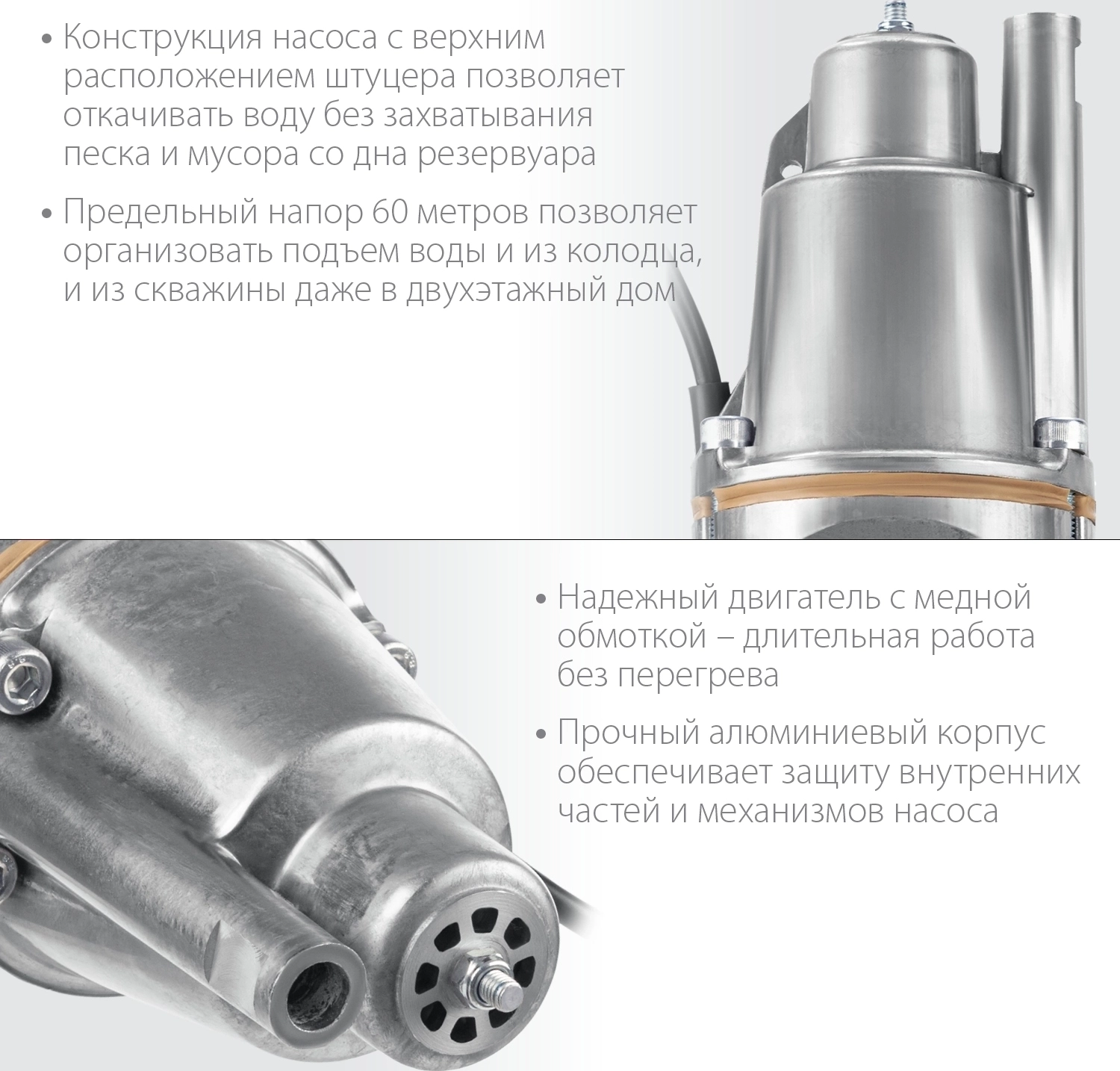 - Предельный Напор 60 метров позволяет организовать подъем воды и из колодца, и из скважины даже в двухэтажный дом