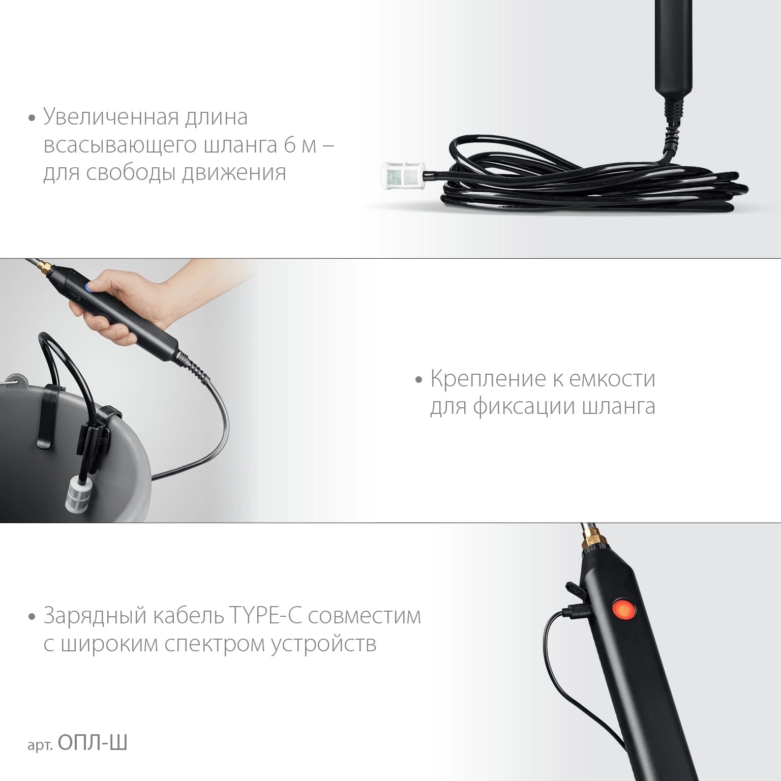 - Увеличенная длина гибкого шланга для свободы движения