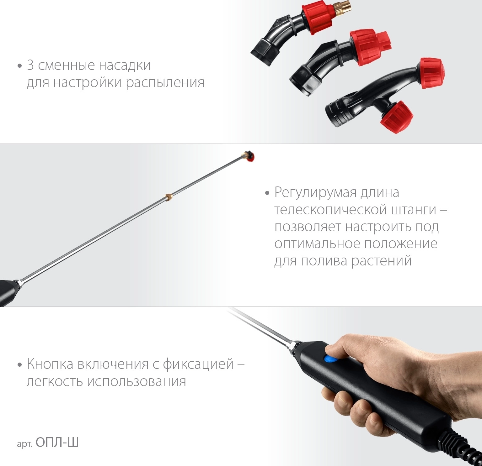 - 3 сменные форсунки для быстрой настройки формы струи под любые задачи
