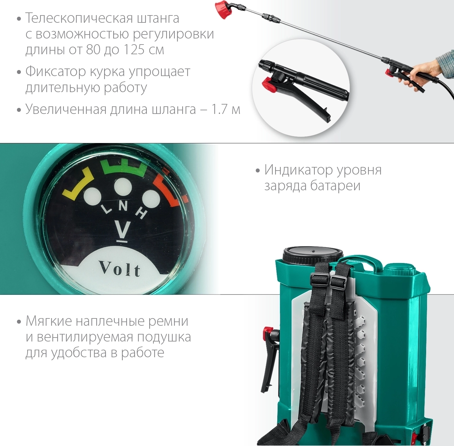 Ранцевый аккумуляторный опрыскиватель отличается эффективностью, мобильностью, экологичностью. Бережно орошает растения. Подходит для дезинфекции помещений и участков, мытья окон и стен, нанесения антисептиков и антипиренов. Работает от свинцово-кислотного аккумулятора. За счет наличия ремней обеспечивается удобство переноски на спине.