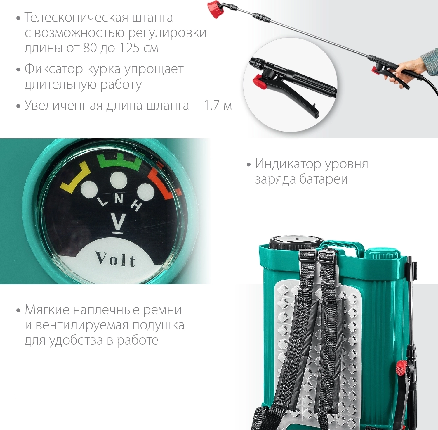 Ранцевый аккумуляторный опрыскиватель отличается эффективностью, мобильностью, экологичностью. Бережно орошает растения. Подходит для дезинфекции помещений и участков, мытья окон и стен, нанесения антисептиков и антипиренов. Работает от свинцово-кислотного аккумулятора. За счет наличия ремней обеспечивается удобство переноски на спине.